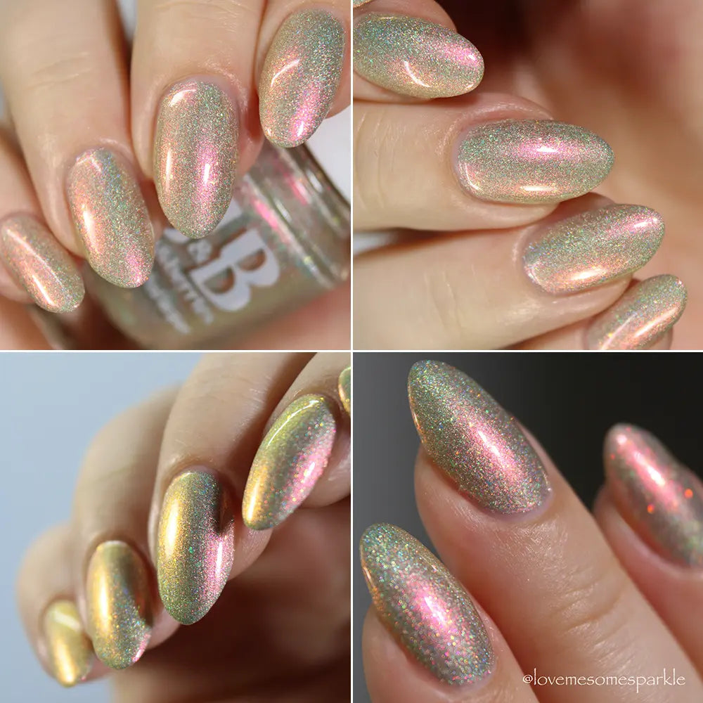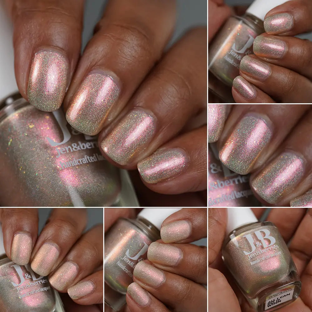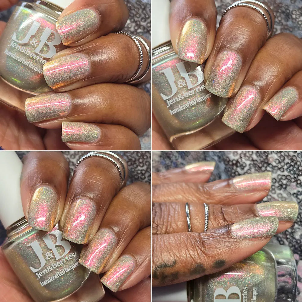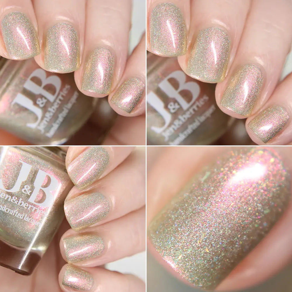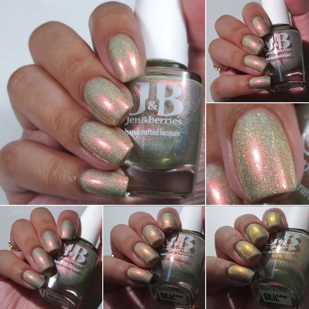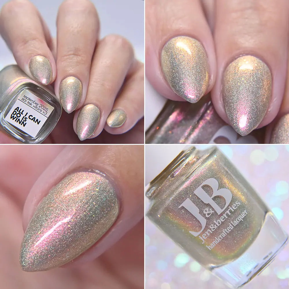All I can do is Winn: Inspired by Winn Adami, this polish has a pale greige velvet linear holographic base with a strong pink/gold shifting shimmer and gold holographic flakes..
