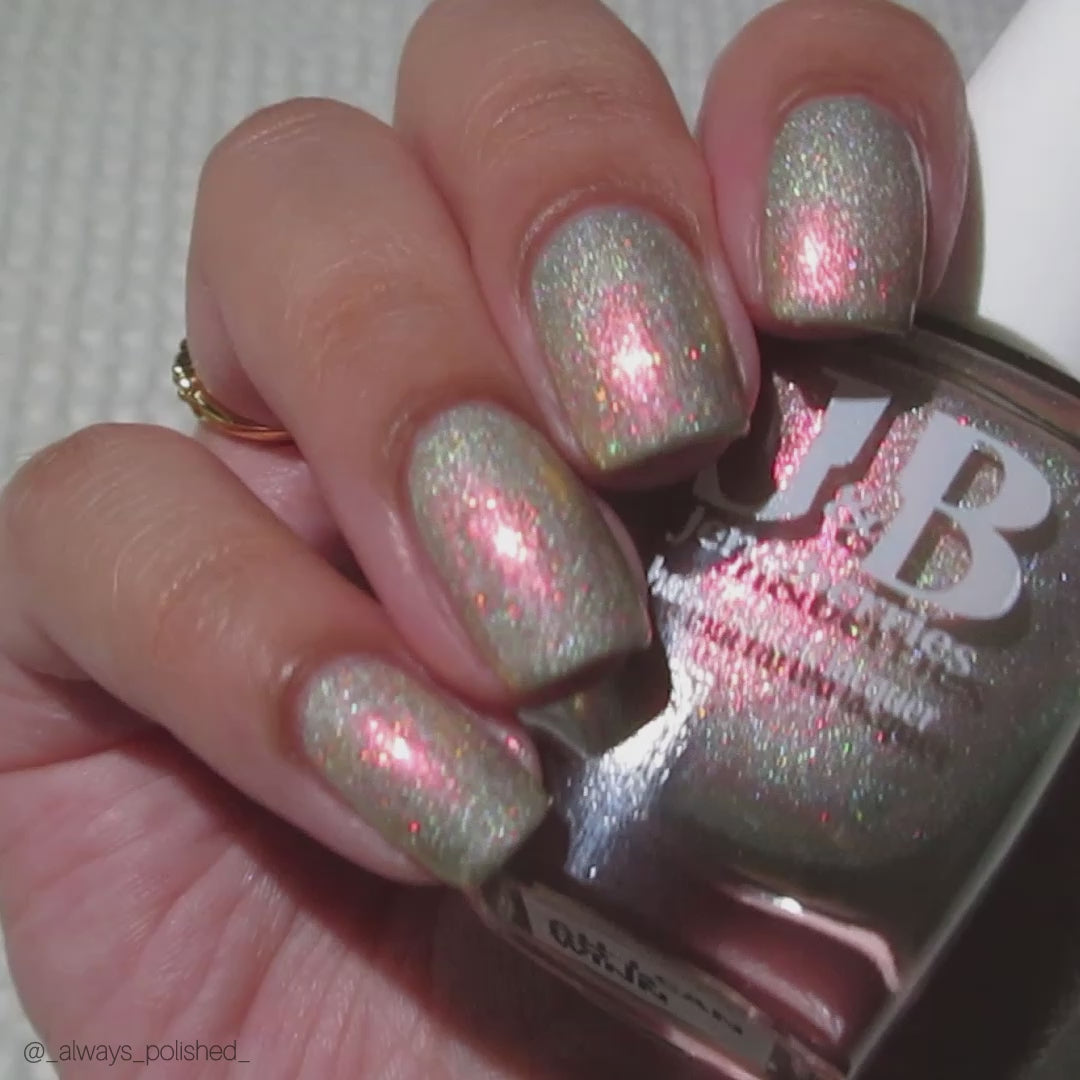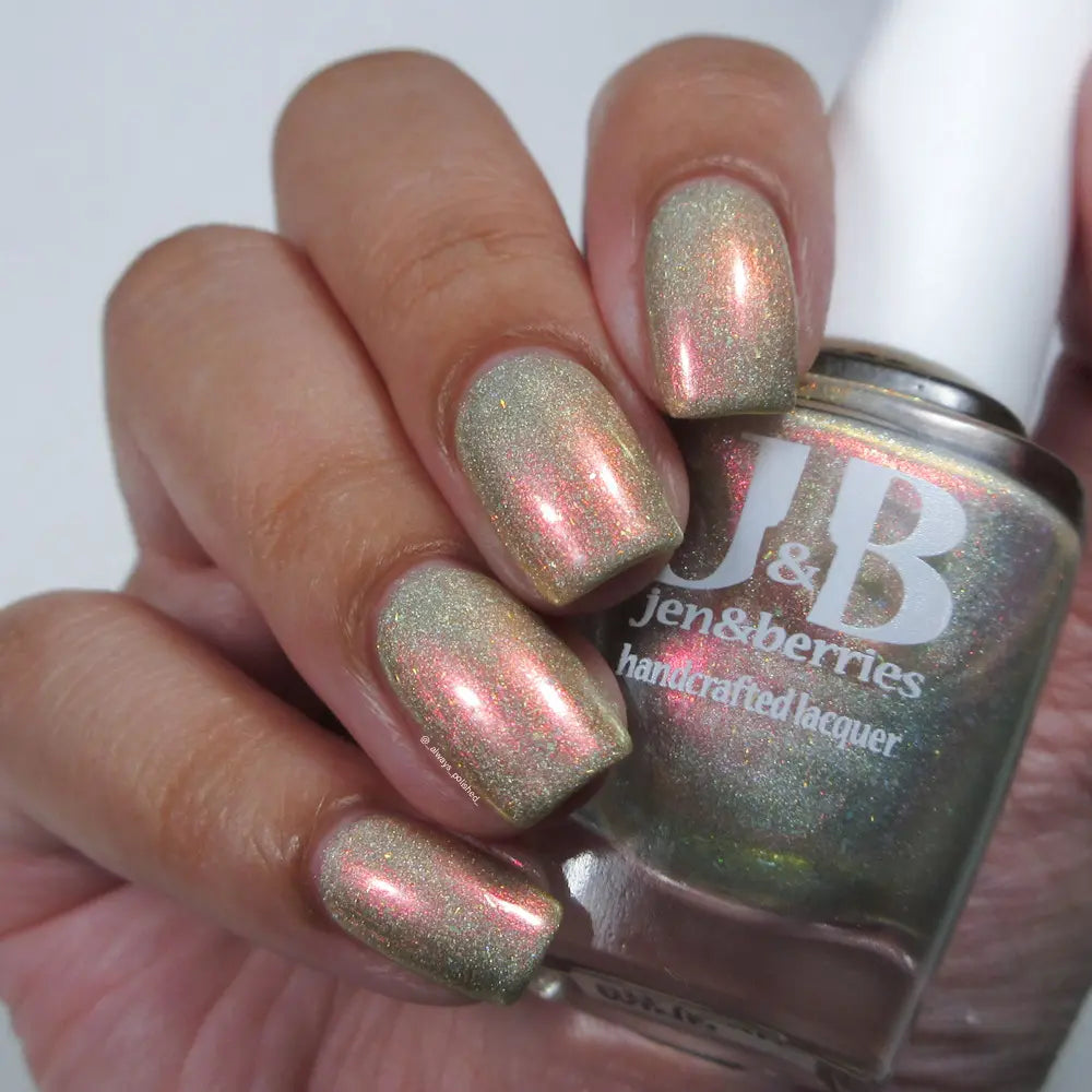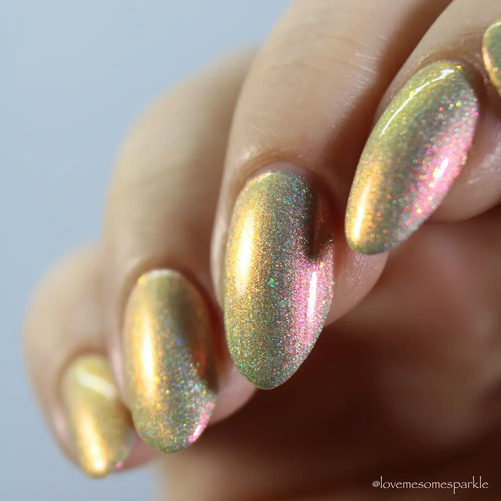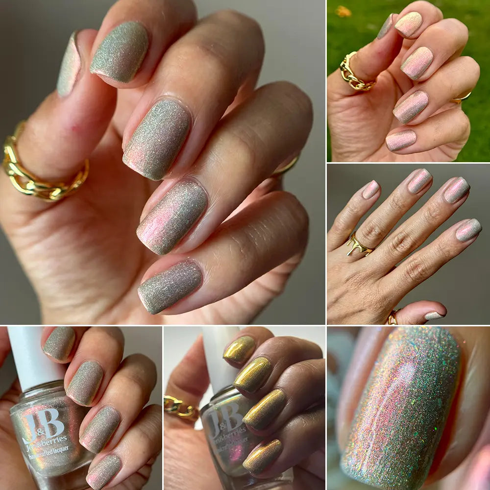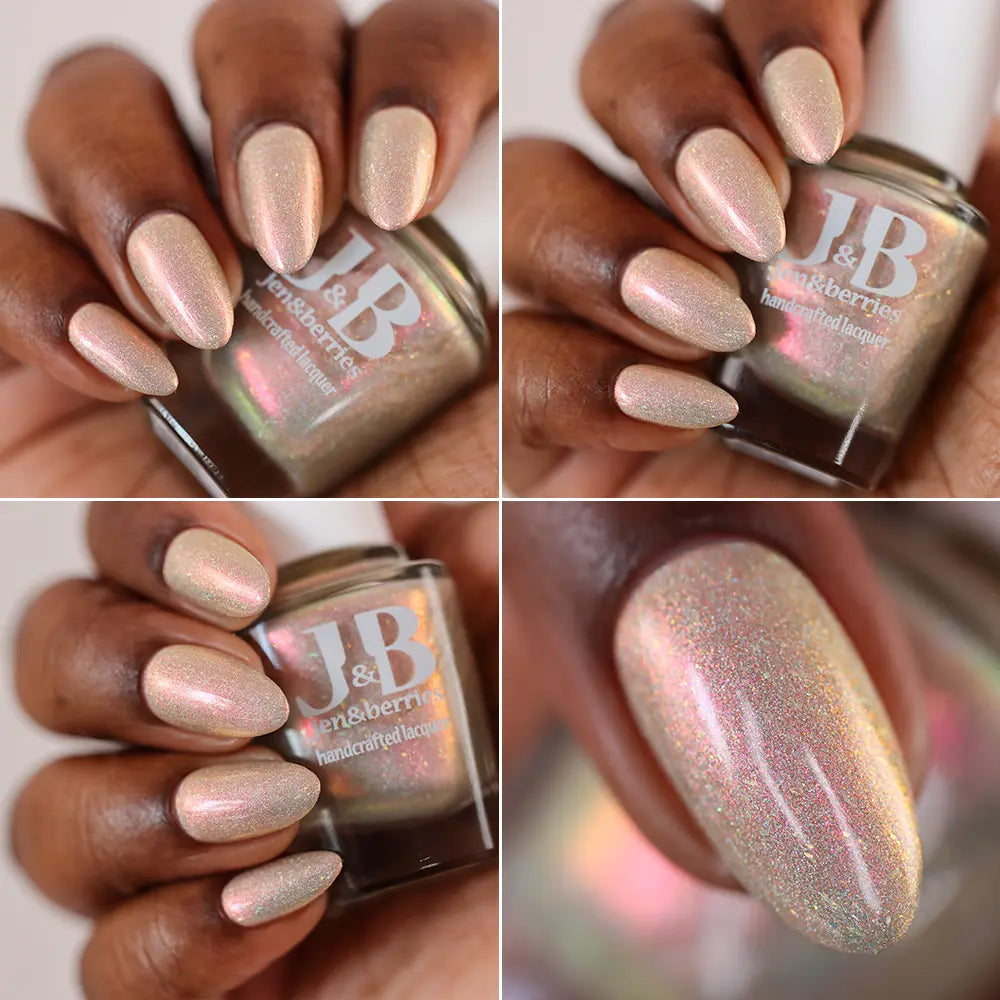 All I can do is Winn: Inspired by Winn Adami, this polish has a pale greige velvet linear holographic base with a strong pink/gold shifting shimmer and gold holographic flakes..