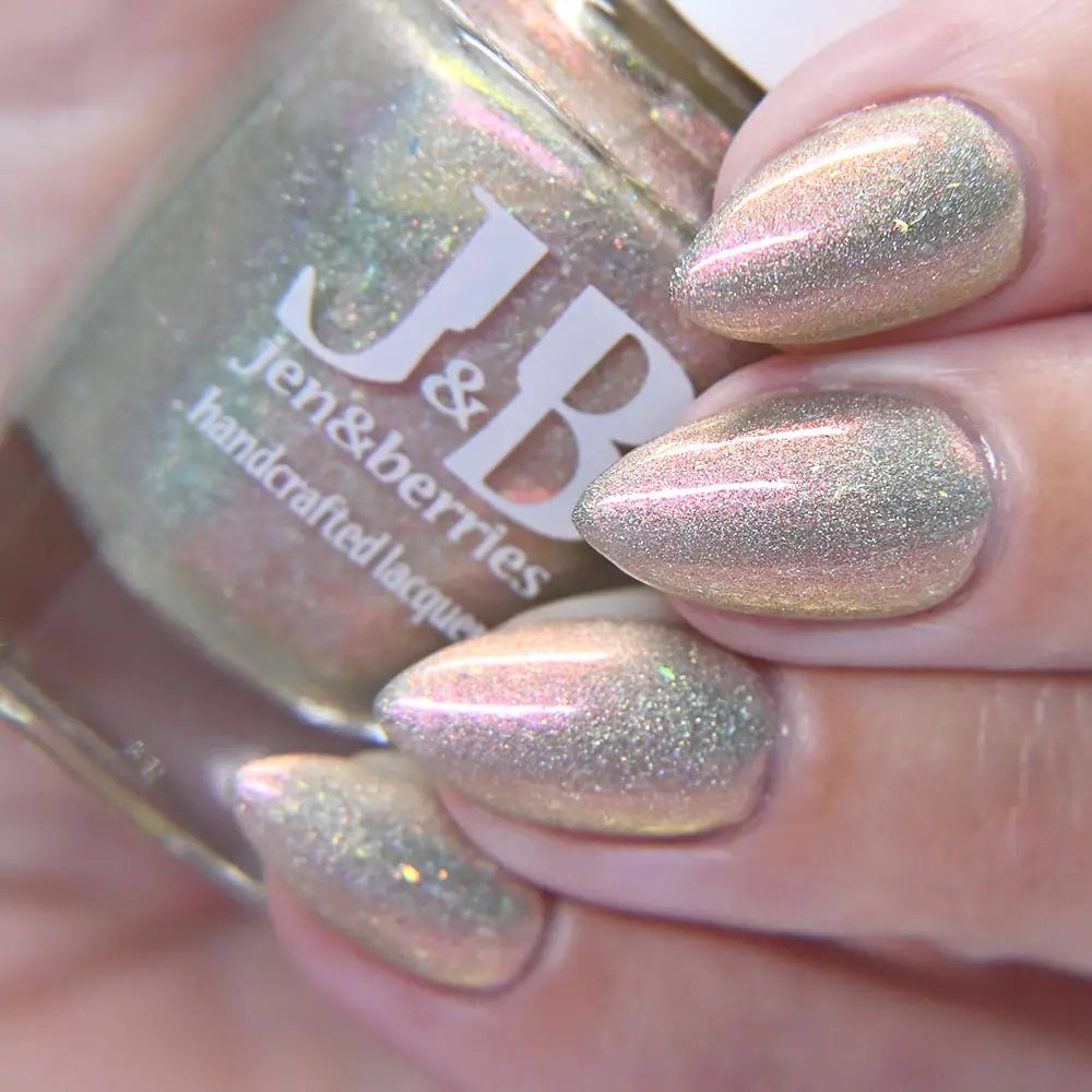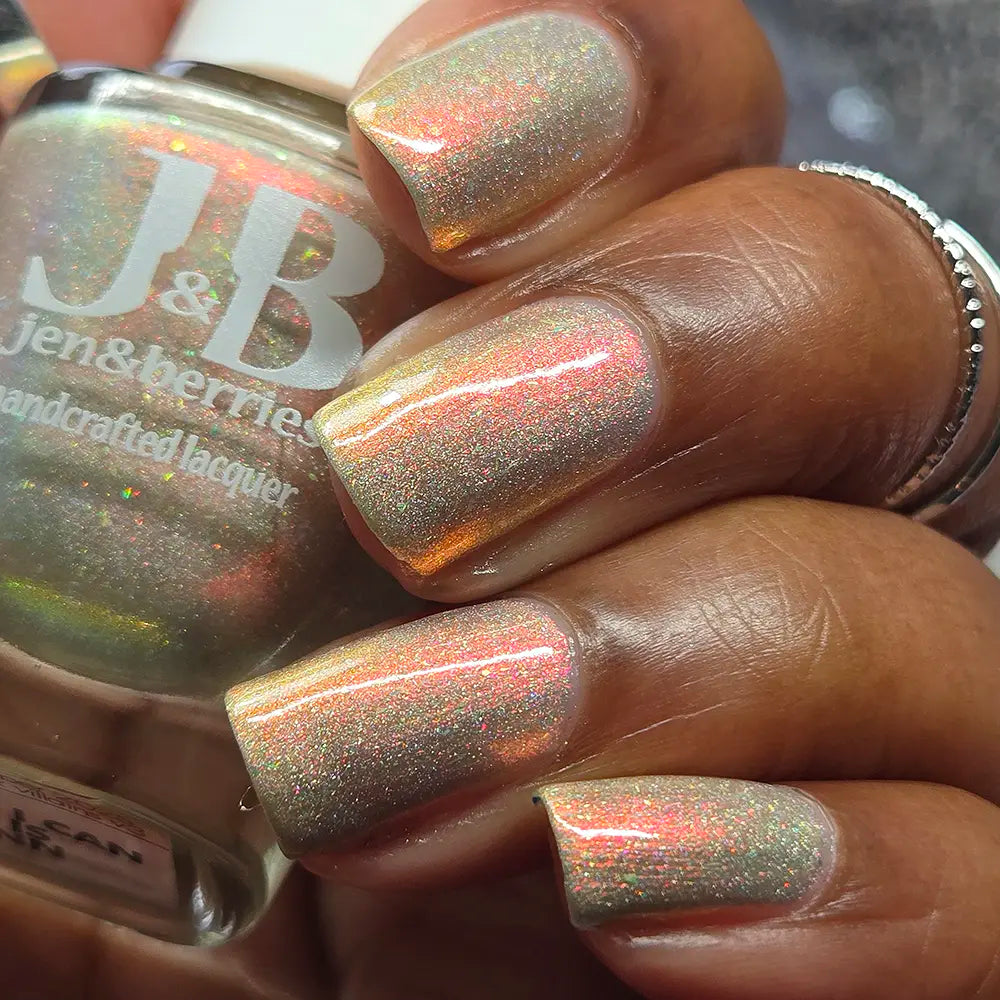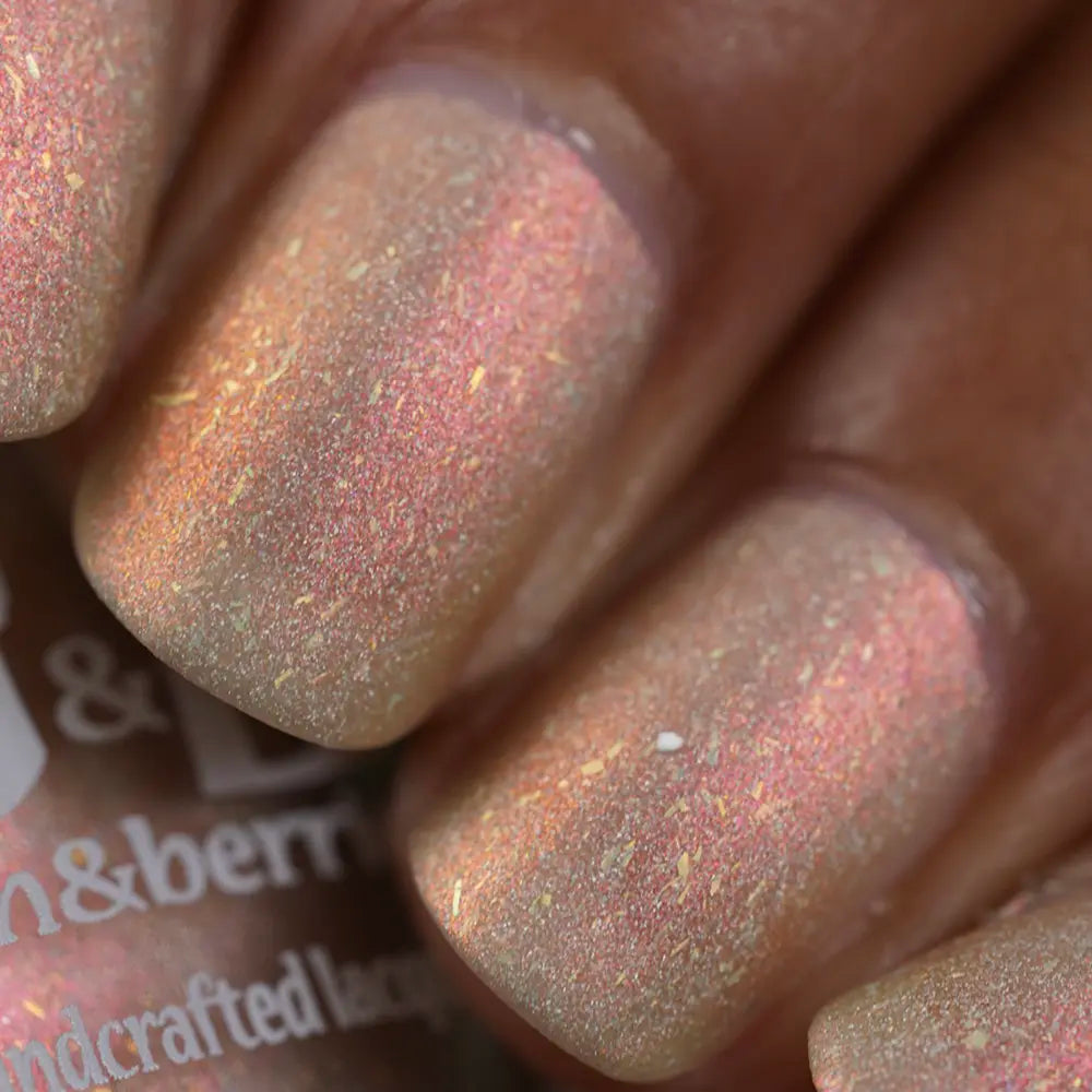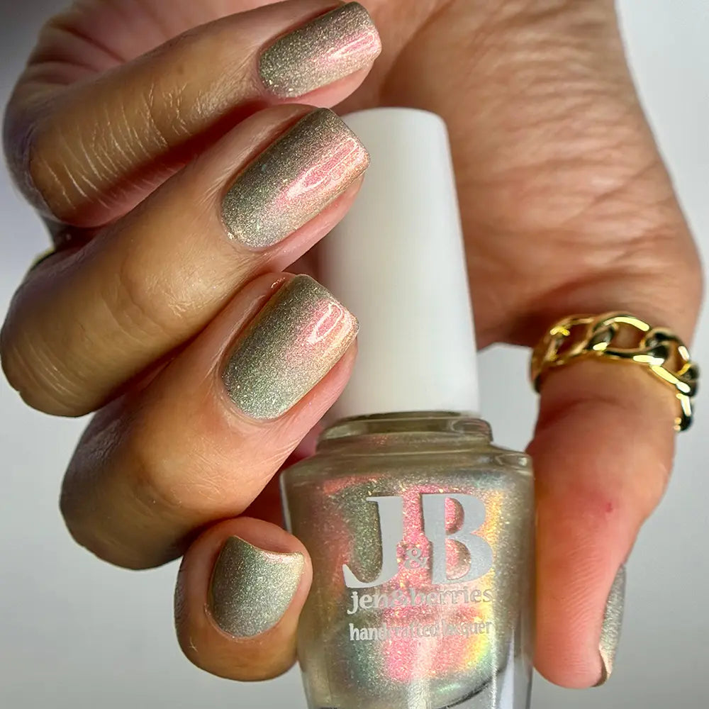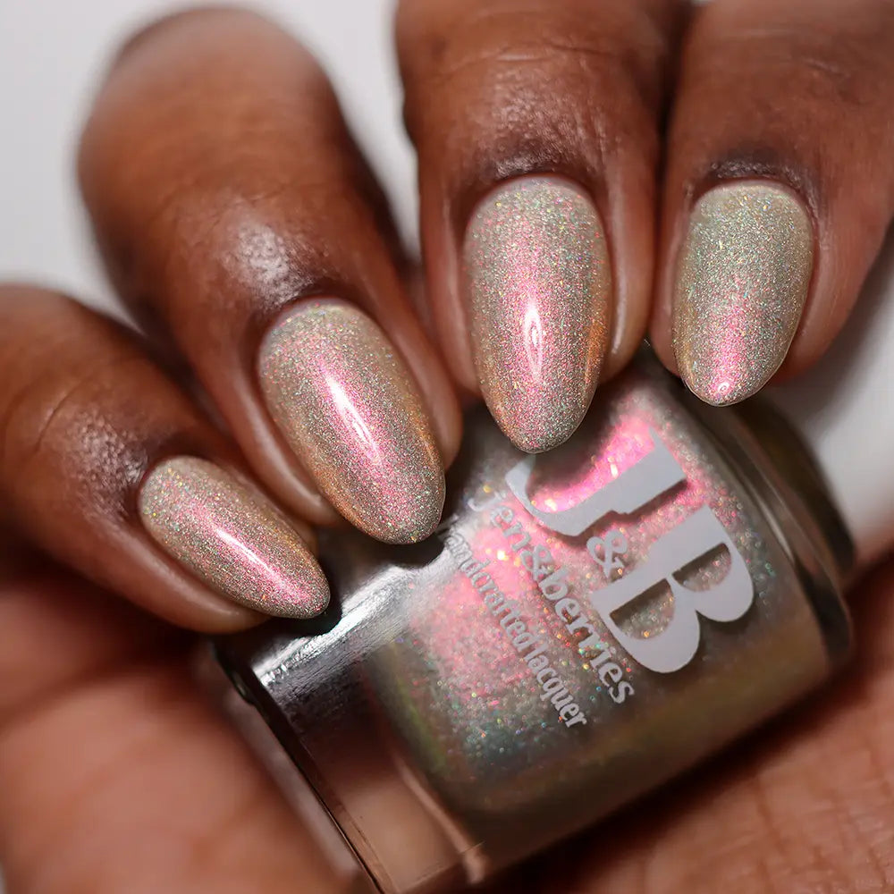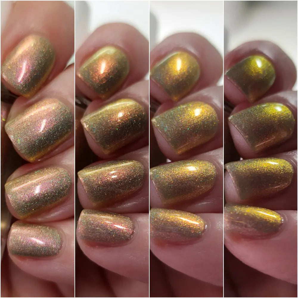 All I can do is Winn: Inspired by Winn Adami, this polish has a pale greige velvet linear holographic base with a strong pink/gold shifting shimmer and gold holographic flakes..
