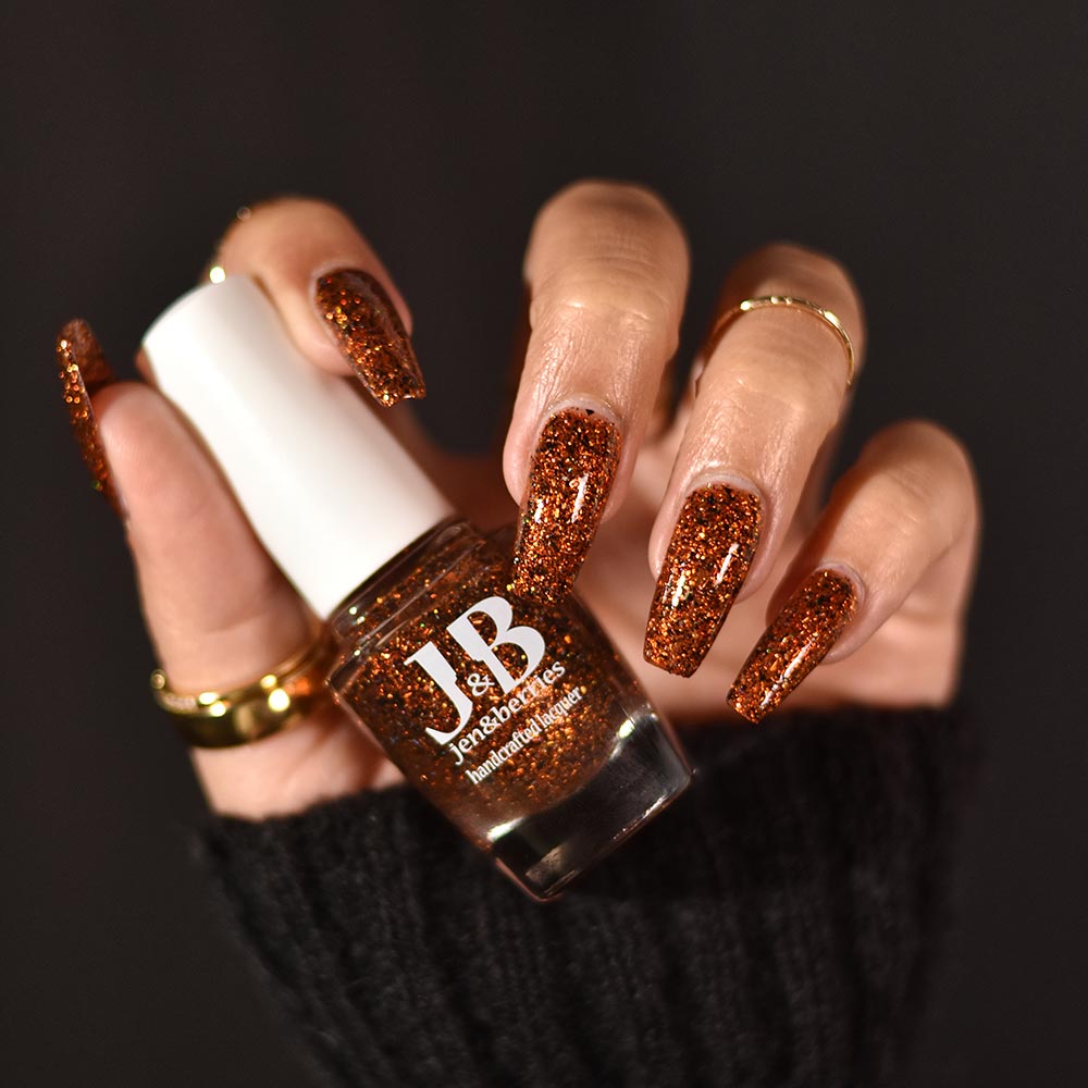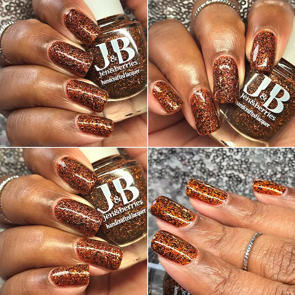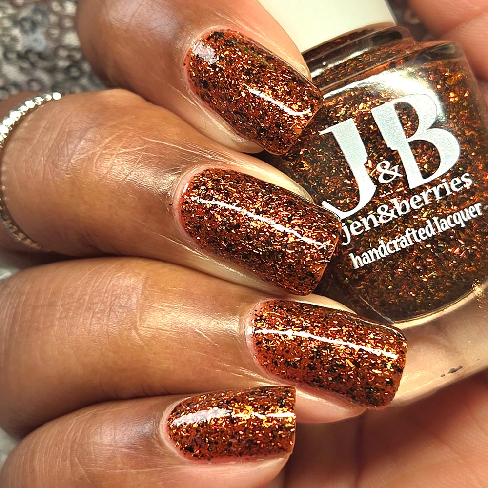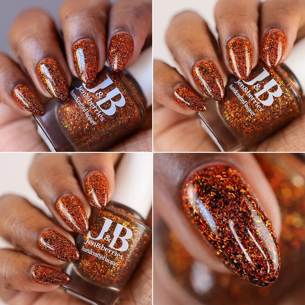 Burnt orange jelly base with rust colored metallic flakes , black flakes and a touch of clear holographic flakes.