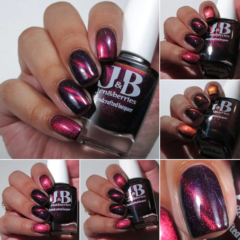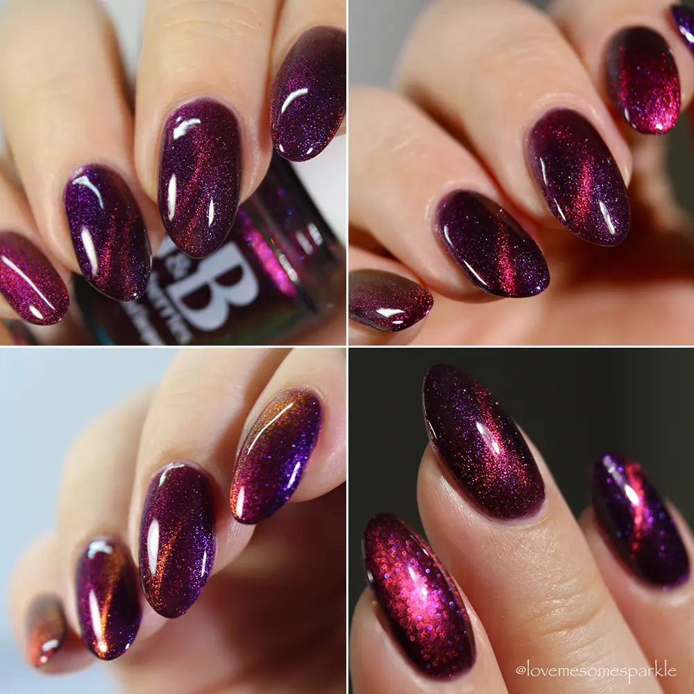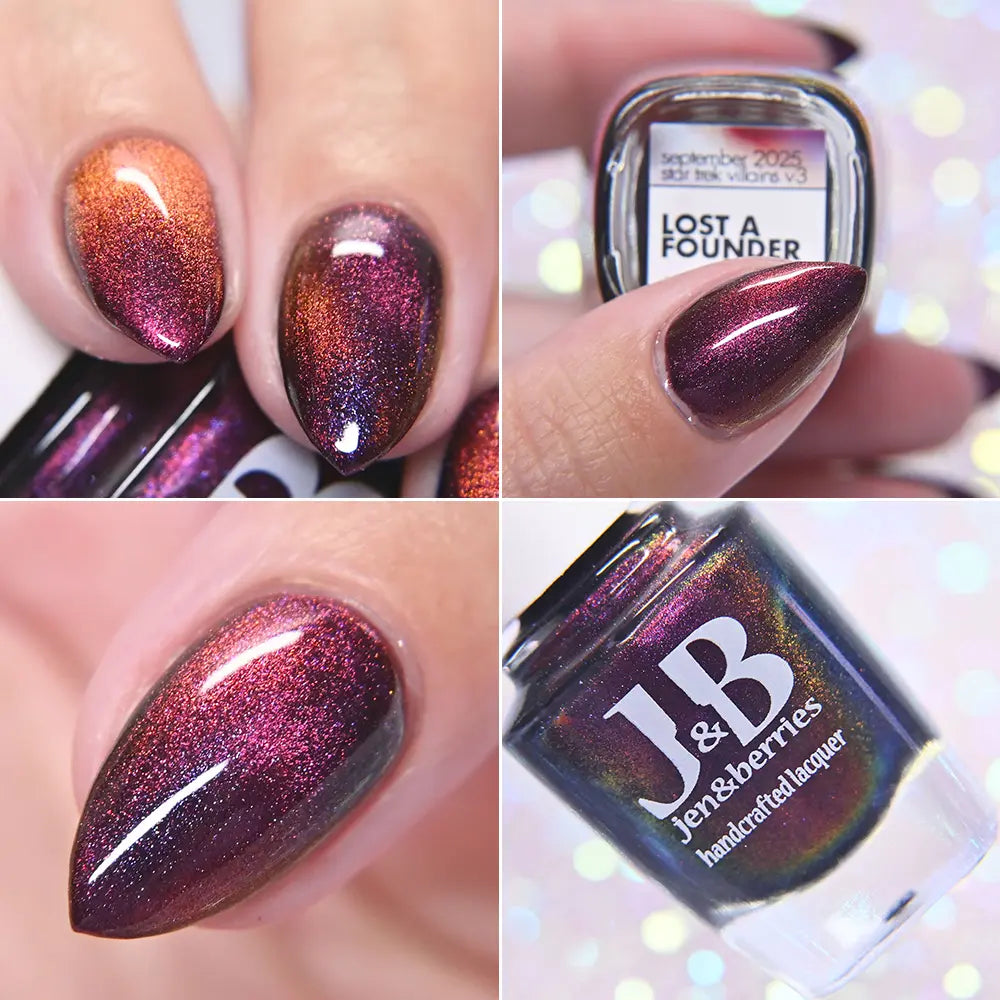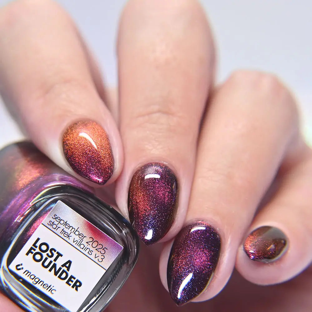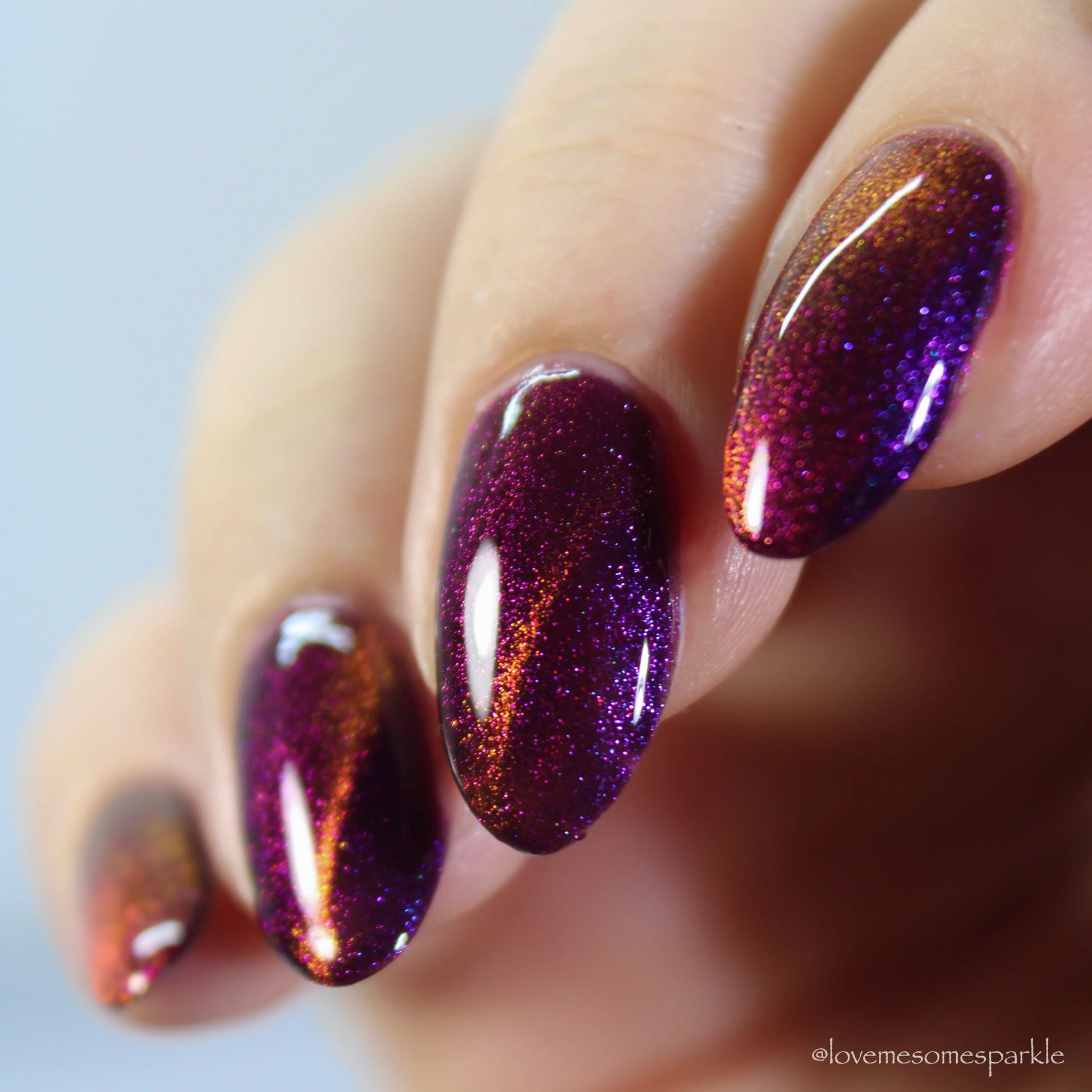 Lost a Founder: Inspired by Kilana, this nail polish has a deep grape purple base with a subtle purple/pink shimmer and red/orange/gold/green (at very extreme angles) magnetic shimmer.