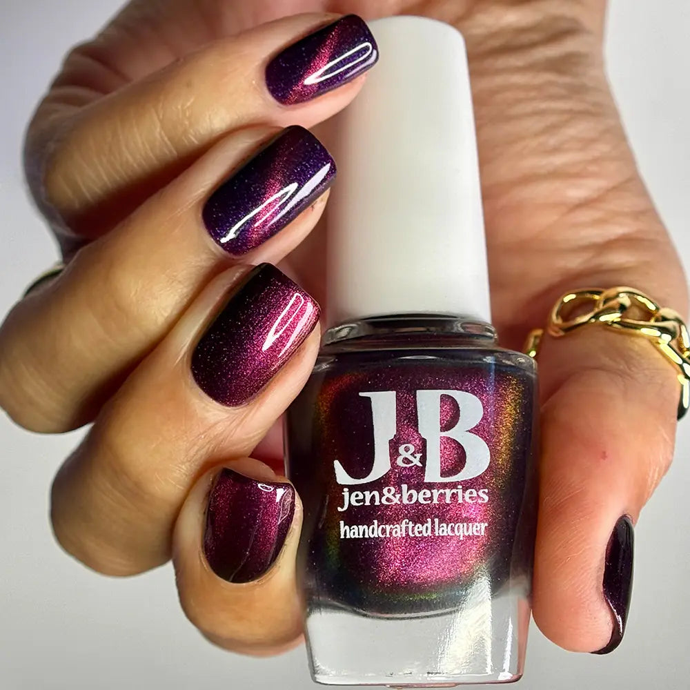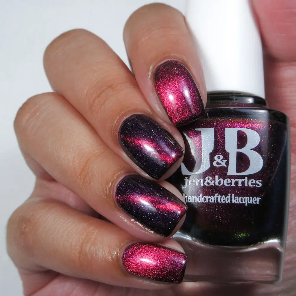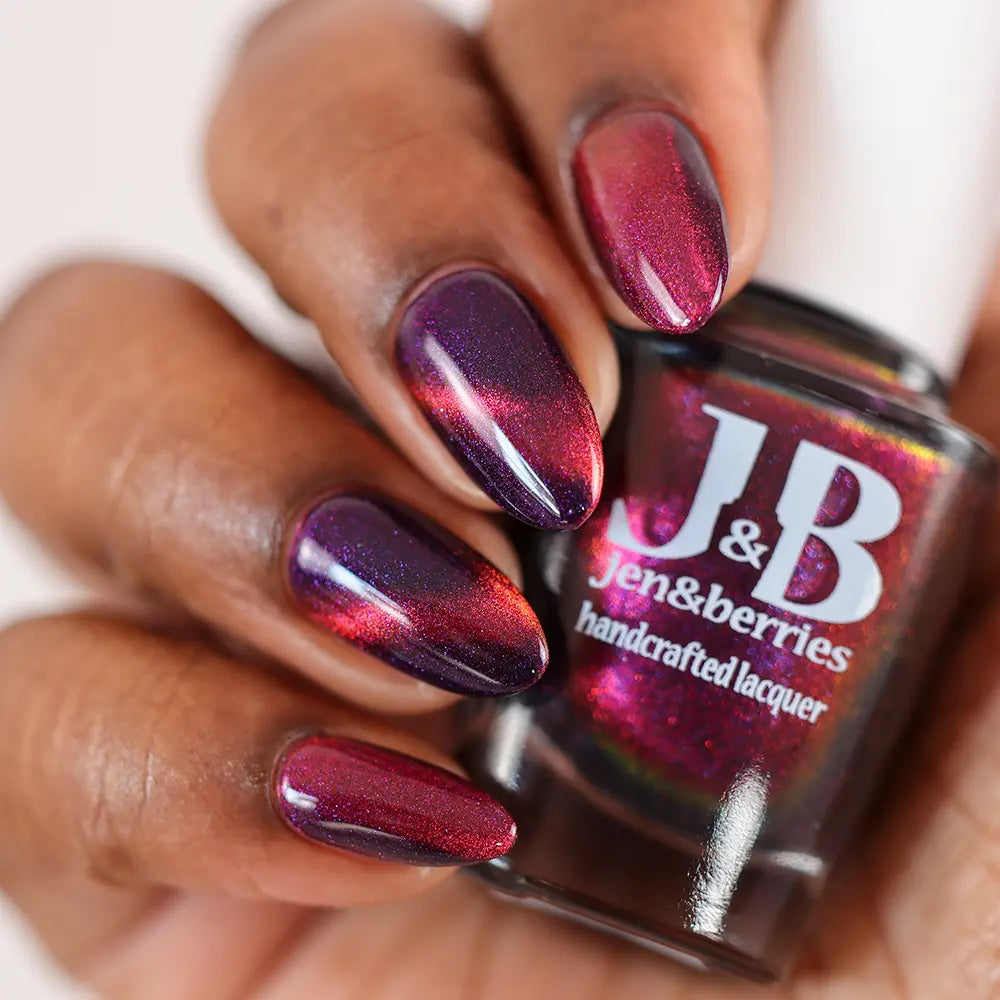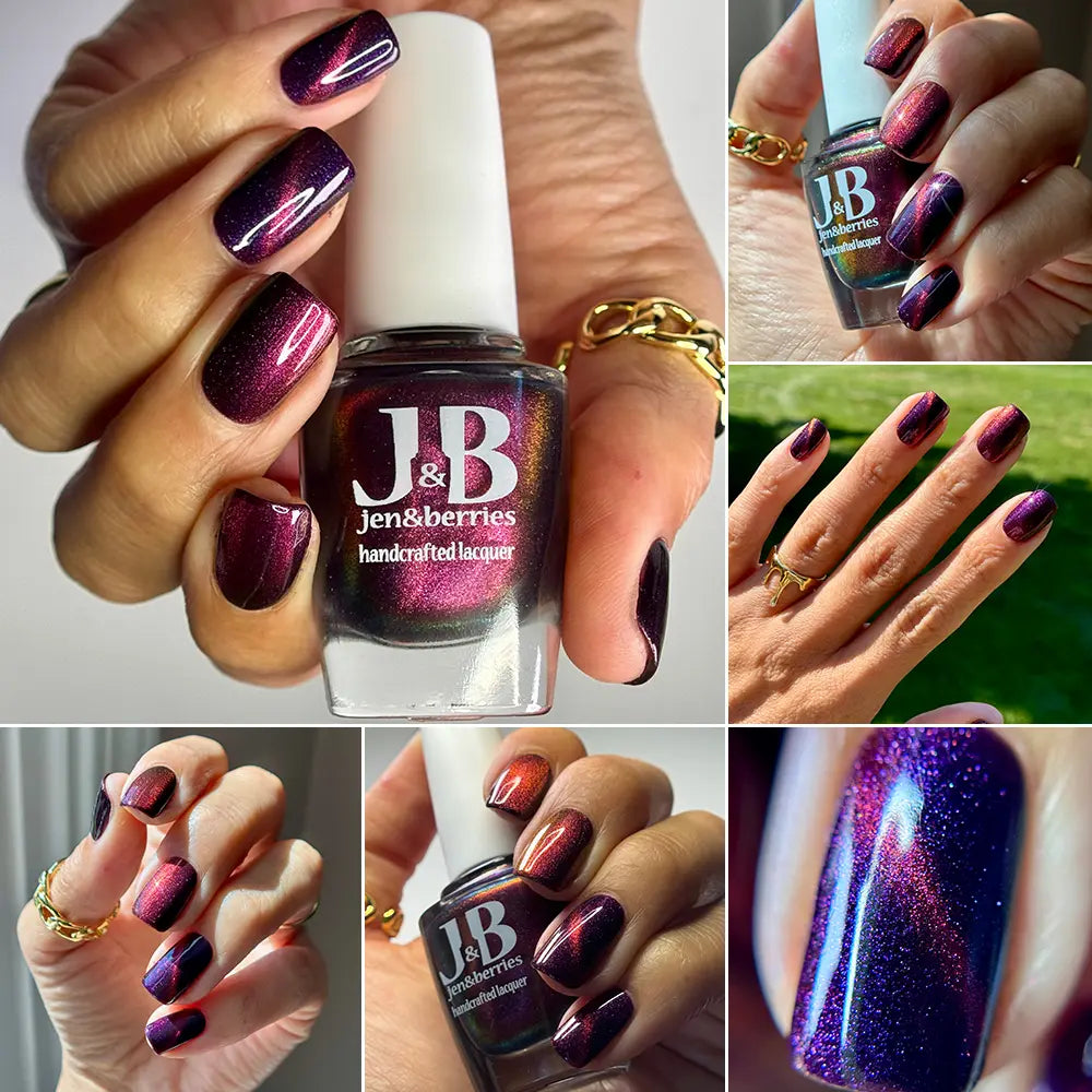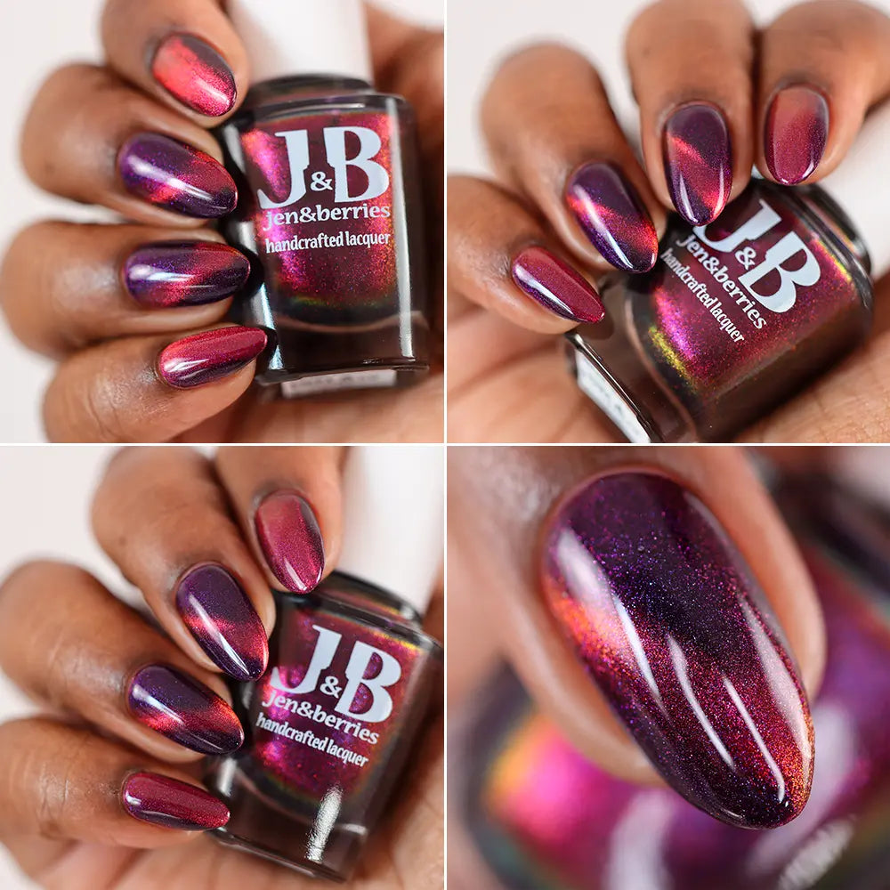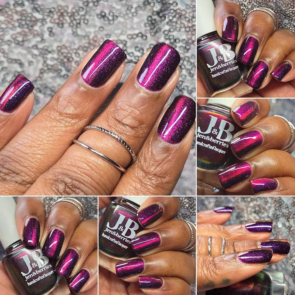 Lost a Founder: Inspired by Kilana, this nail polish has a deep grape purple base with a subtle purple/pink shimmer and red/orange/gold/green (at very extreme angles) magnetic shimmer.
