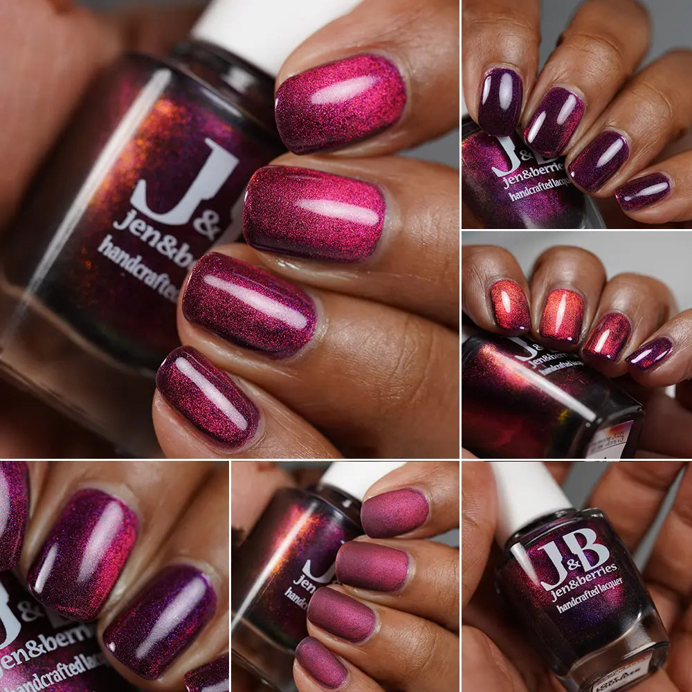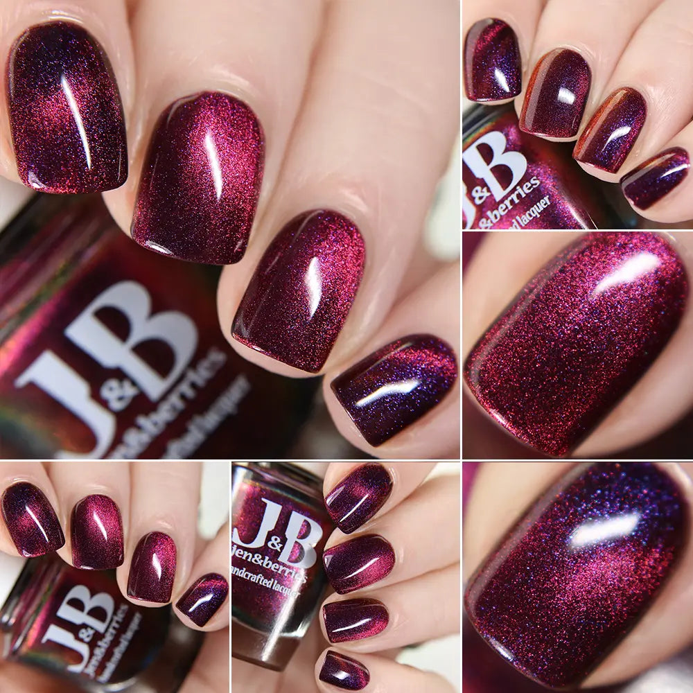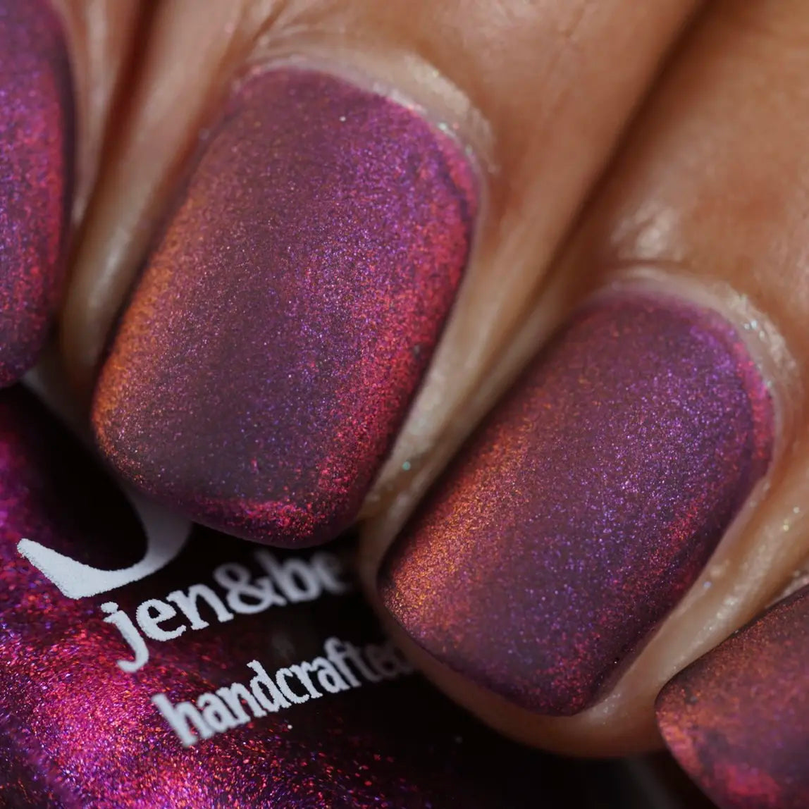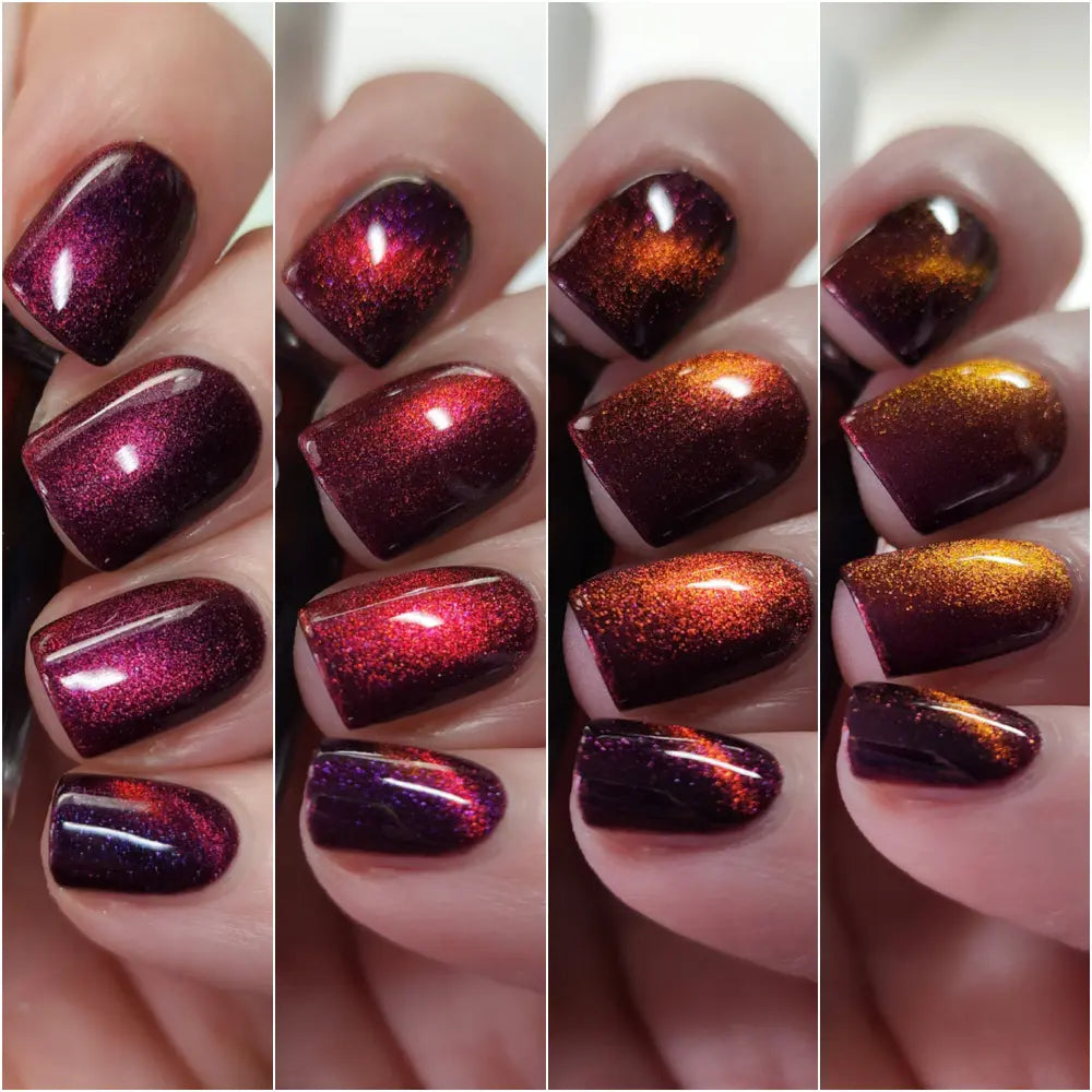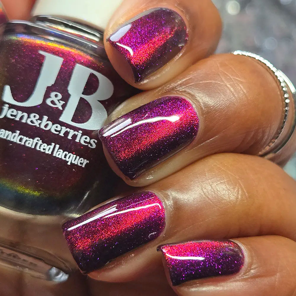 Lost a Founder: Inspired by Kilana, this nail polish has a deep grape purple base with a subtle purple/pink shimmer and red/orange/gold/green (at very extreme angles) magnetic shimmer.