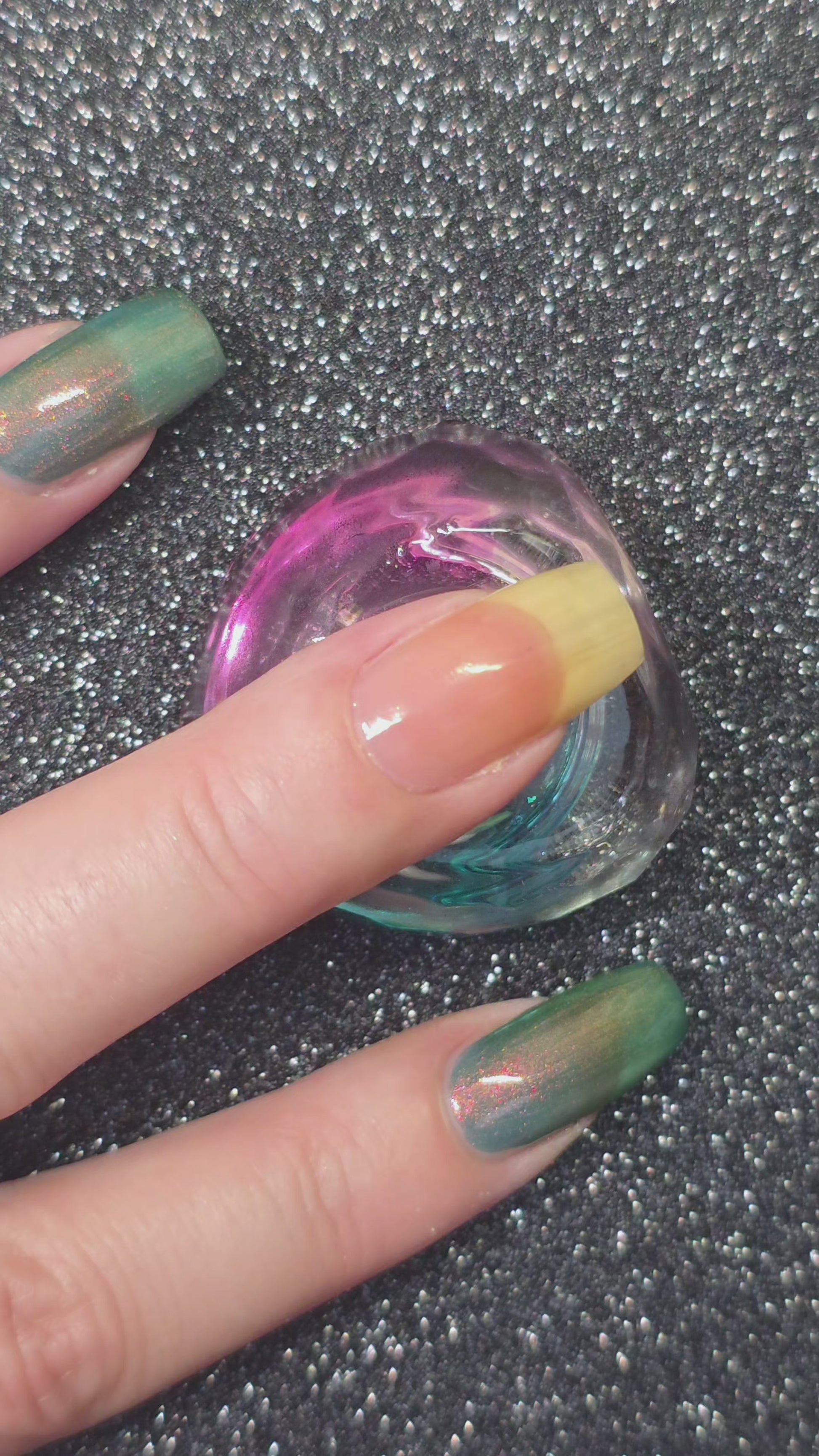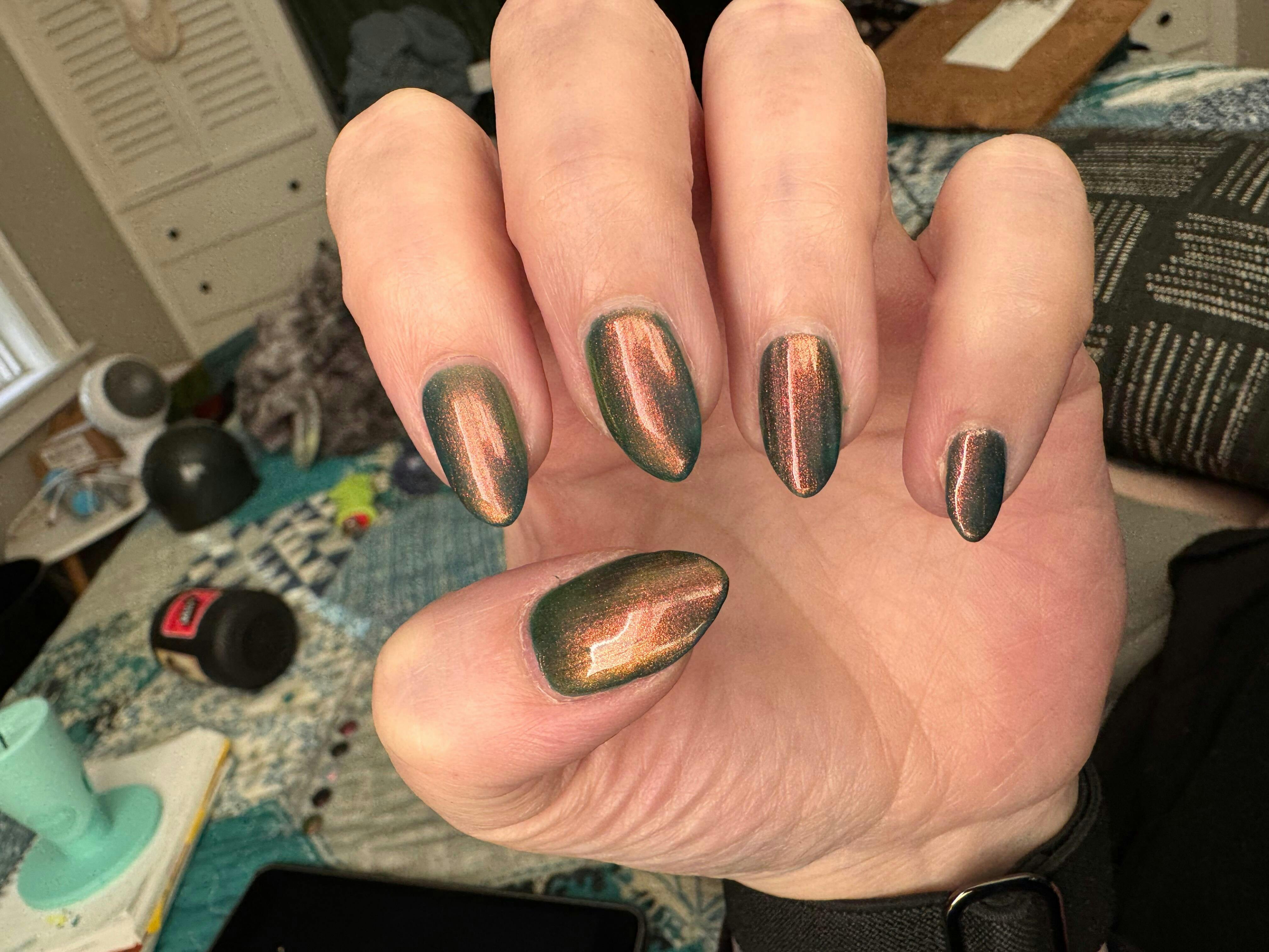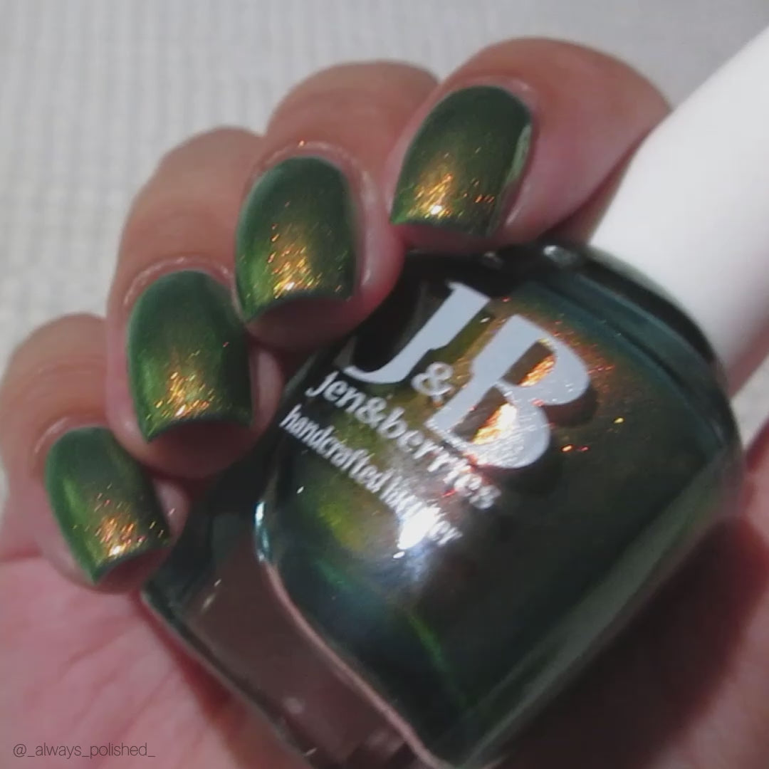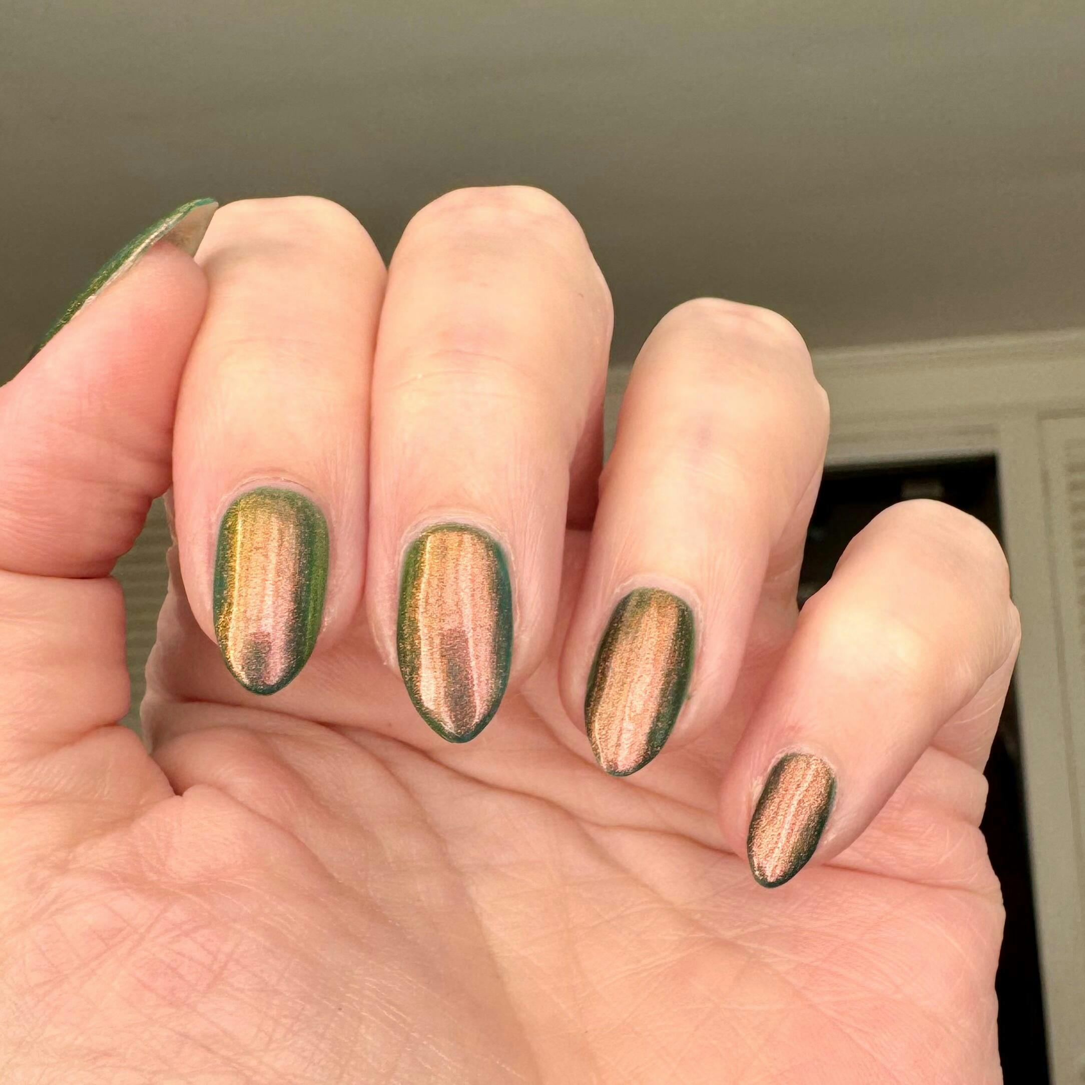 Inspired by Garak, when he offers the lesson he took upon hearing about The Boy Who Cried Wolf, Never Tell the Same Lie Twice has a teal jelly base with intense pink/copper/gold/green shifting aurora shimmer.