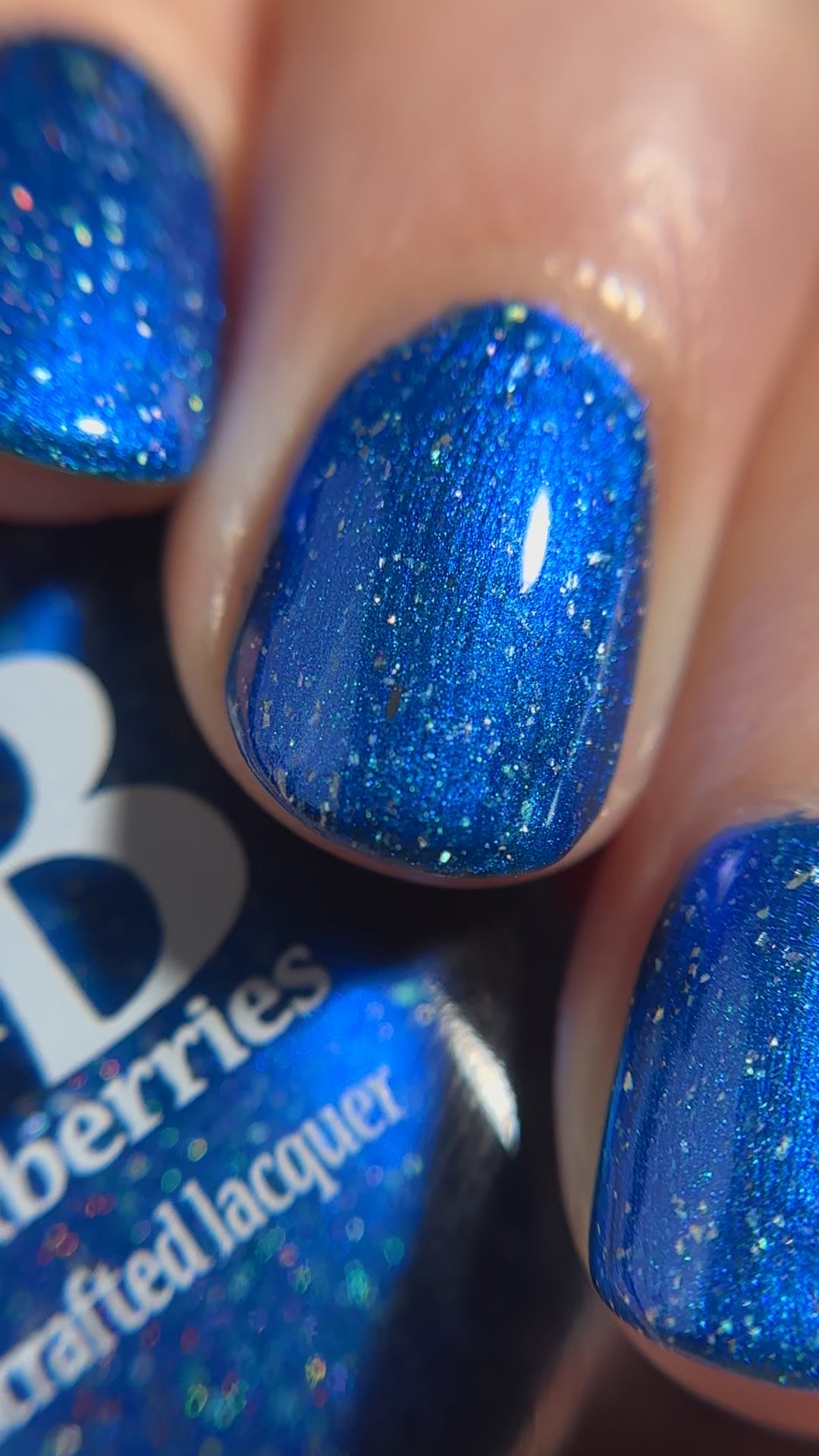 This is a cobalt blue jelly nail polish with a glowy blue/violet shimmer and multiple sizes of holographic flakes.