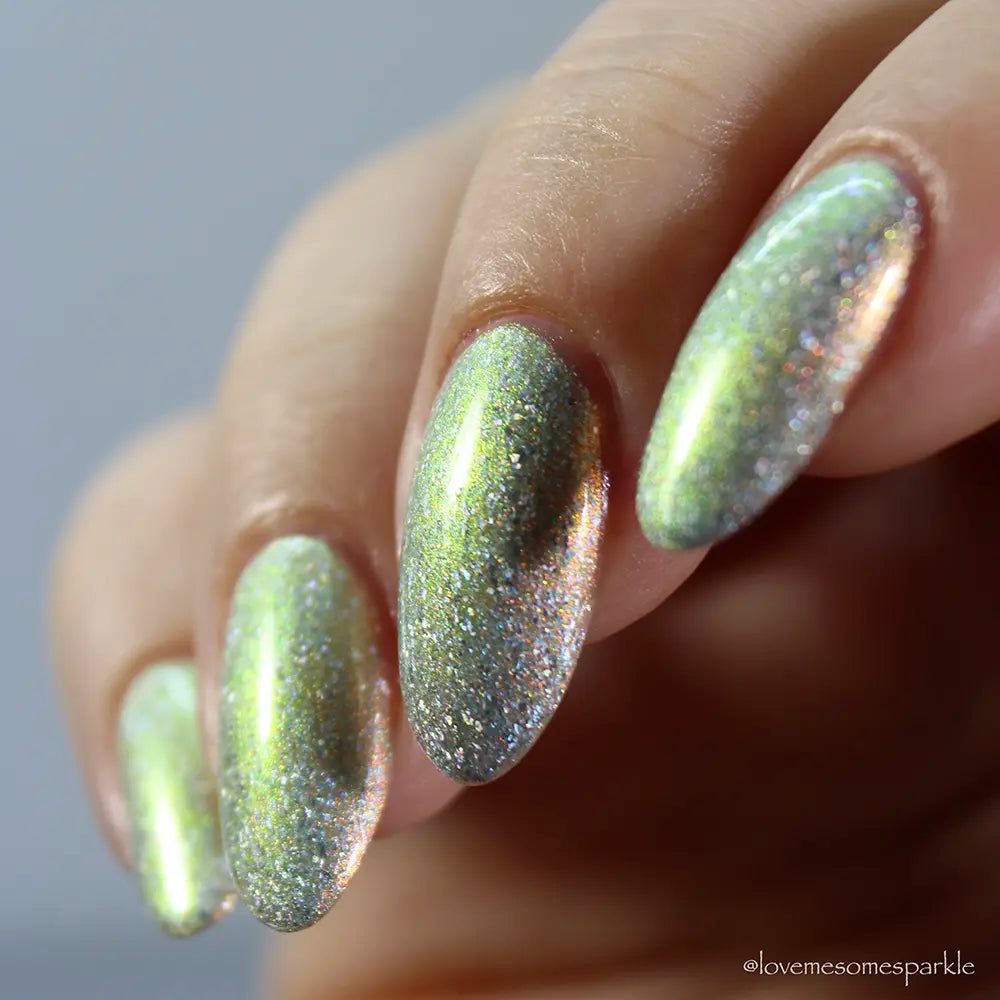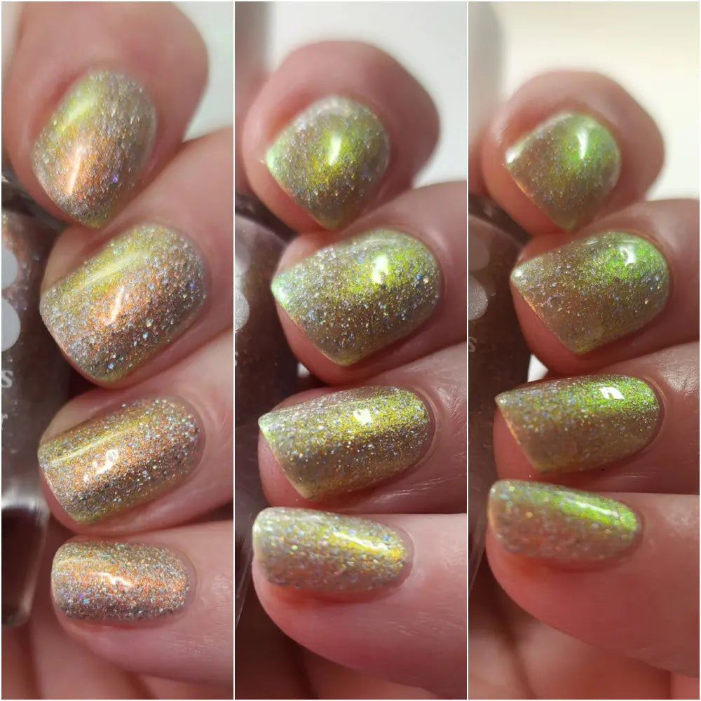 A clear base packed with intense copper/gold/green shifting shimmer reminiscent of heirloom gourds and holographic flakes.