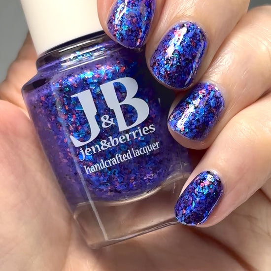 Seskapades was inspired by the Cardassian spy, Seska, and is a blurple jelly nail polish packed with glowy blue/purple and pink/orange iridescent shifting flakes and black flakes.