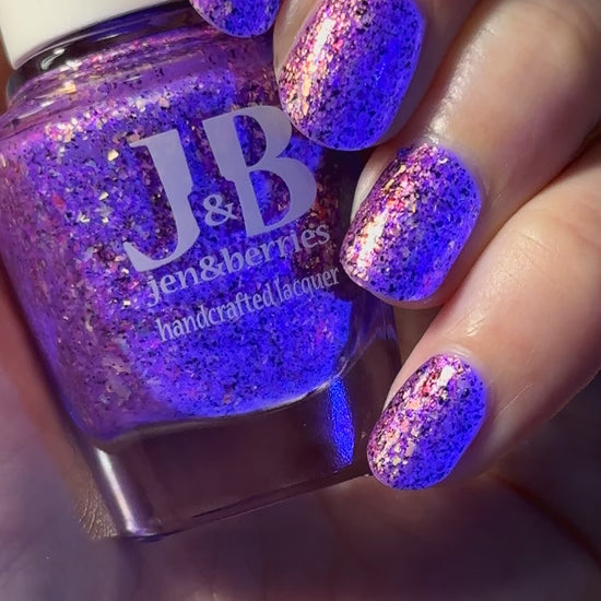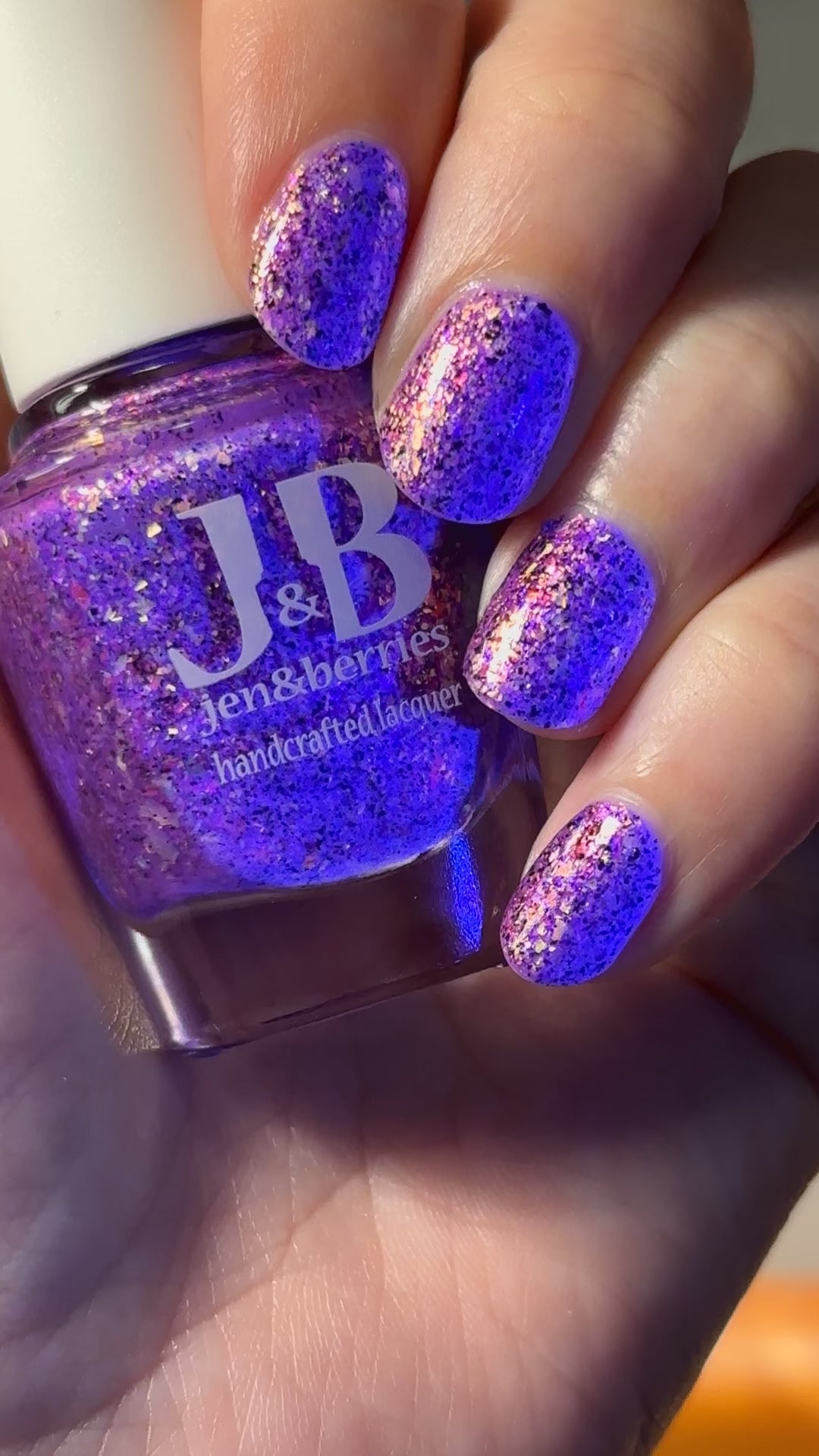 Inspired by an illustrations of witches surrounding a cauldron (with a little help from Prodigy for the name!) Neon purple jelly packed with violet-magenta shifty iridescent and black flakes with contrasting gold/yellow shifty iridescent flakes. * This hue was created with pink and blue pigments, not fade-prone purple!