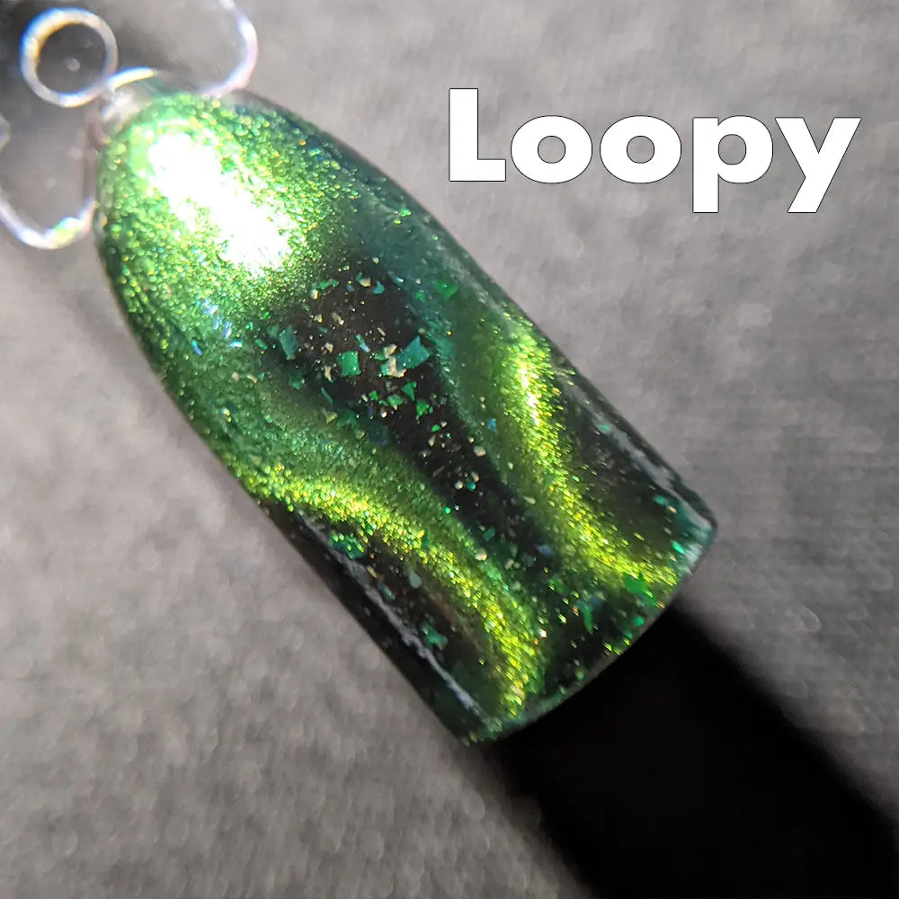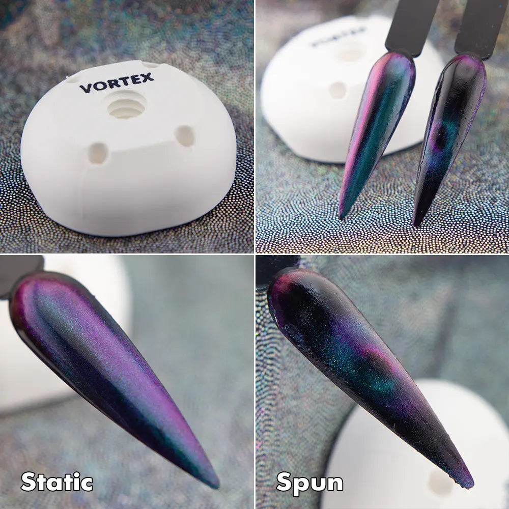 Vortex puck - The Vortex puck in a static position creates two parallel lines of magnetic particles. The width between them is dependent on how close the puck is set. If the Vortex puck is spinning, the lines are formed in a circle. Magnetic polishes that have a wider color shift, such as snazberries, can create a whorl of color with spinning.