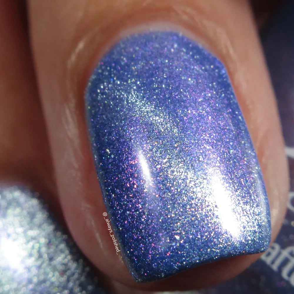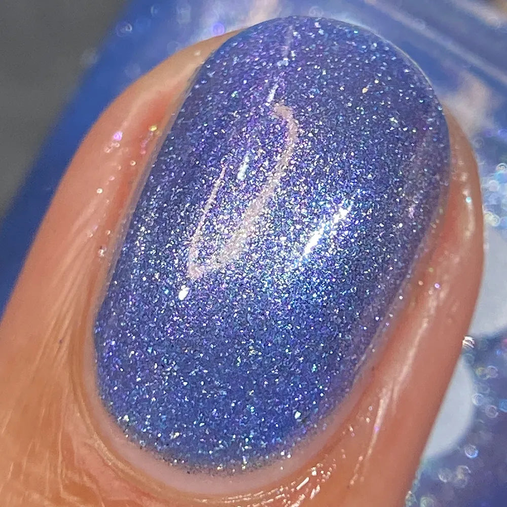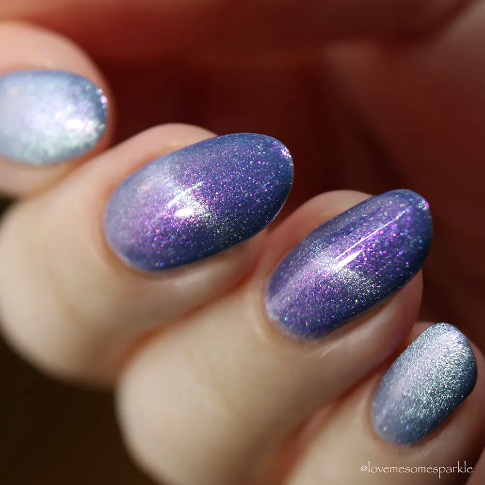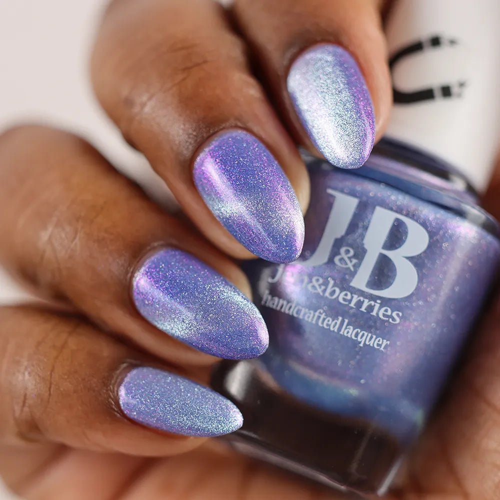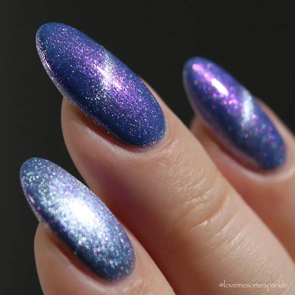 From the Lord of the Rings collab with @lovemesomesparkle, Still Counts as One is a periwinkle crelly nail polish with a purple/pink shifty shimmer, holographic microflakes and silver magnetic shimmer.