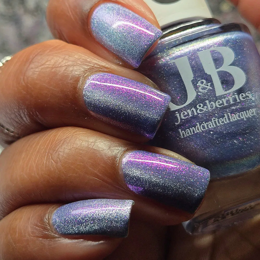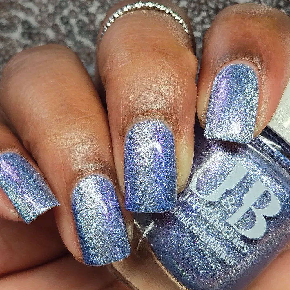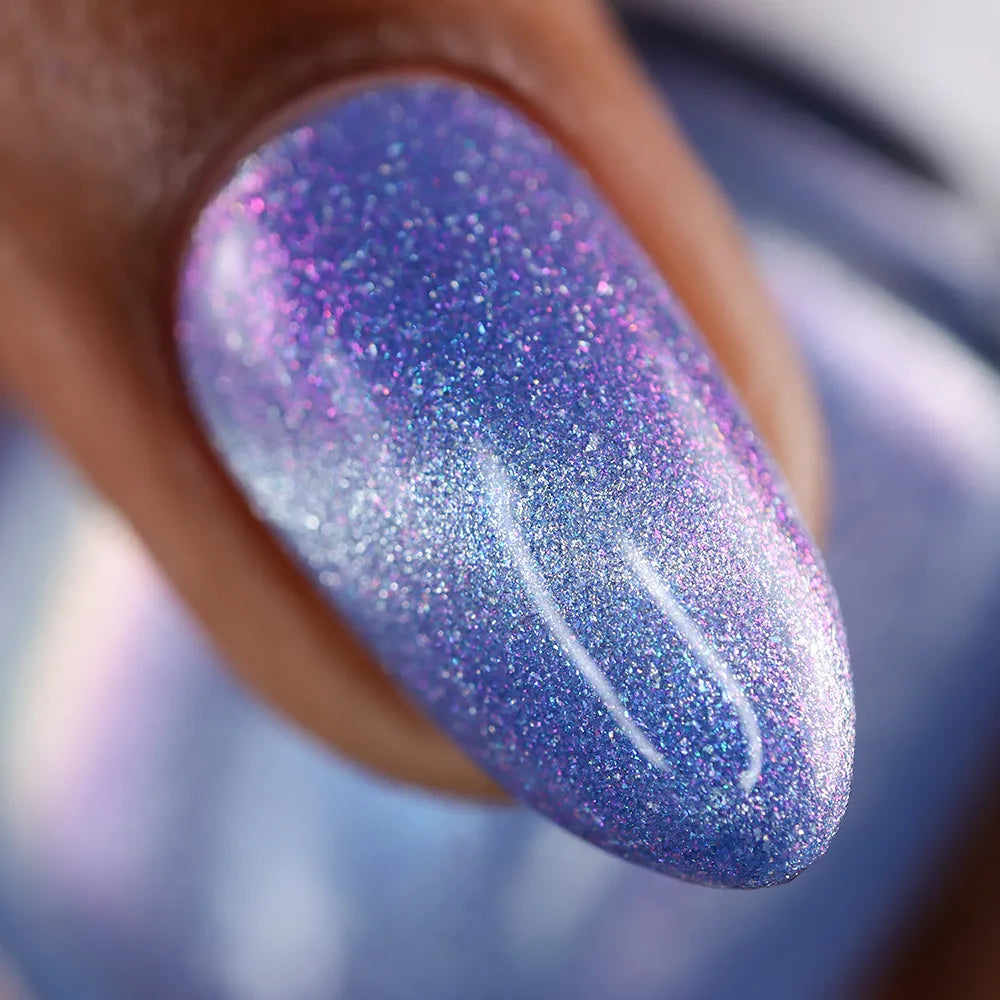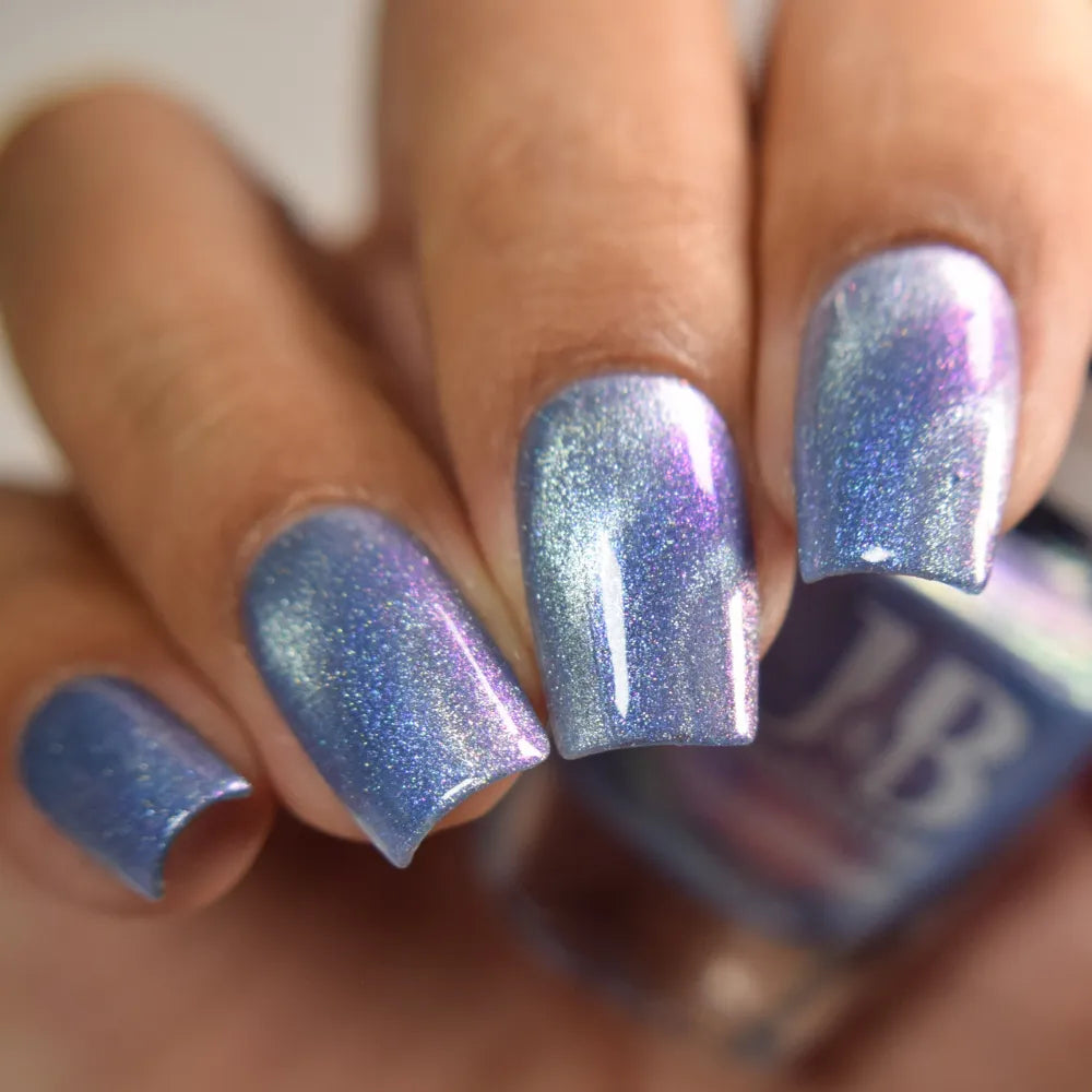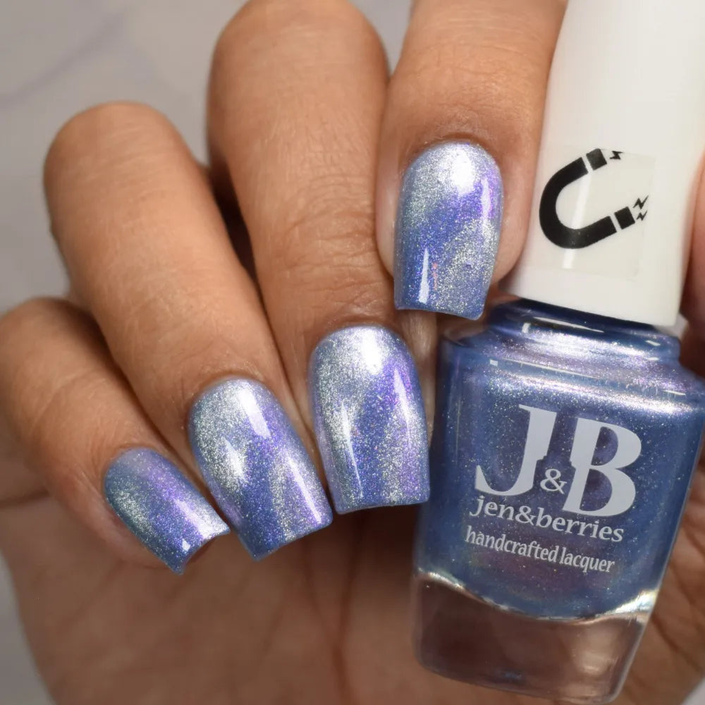 From the Lord of the Rings collab with @lovemesomesparkle, Still Counts as One is a periwinkle crelly nail polish with a purple/pink shifty shimmer, holographic microflakes and silver magnetic shimmer.