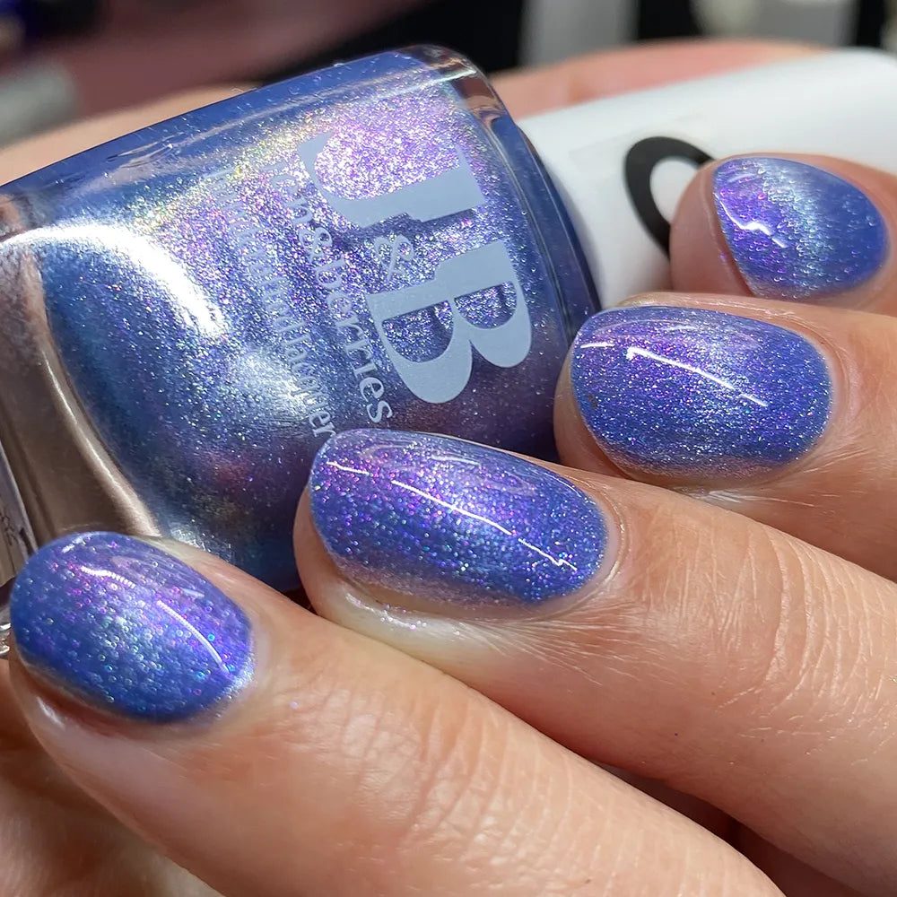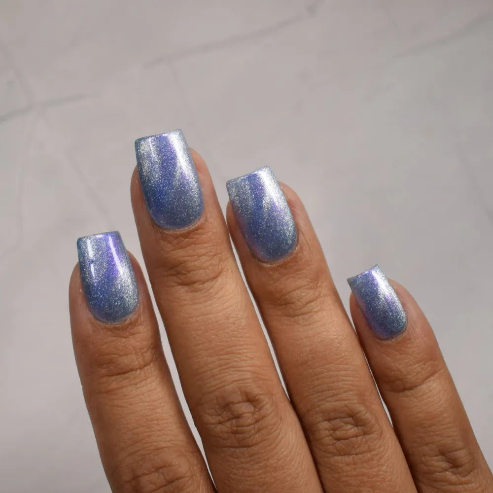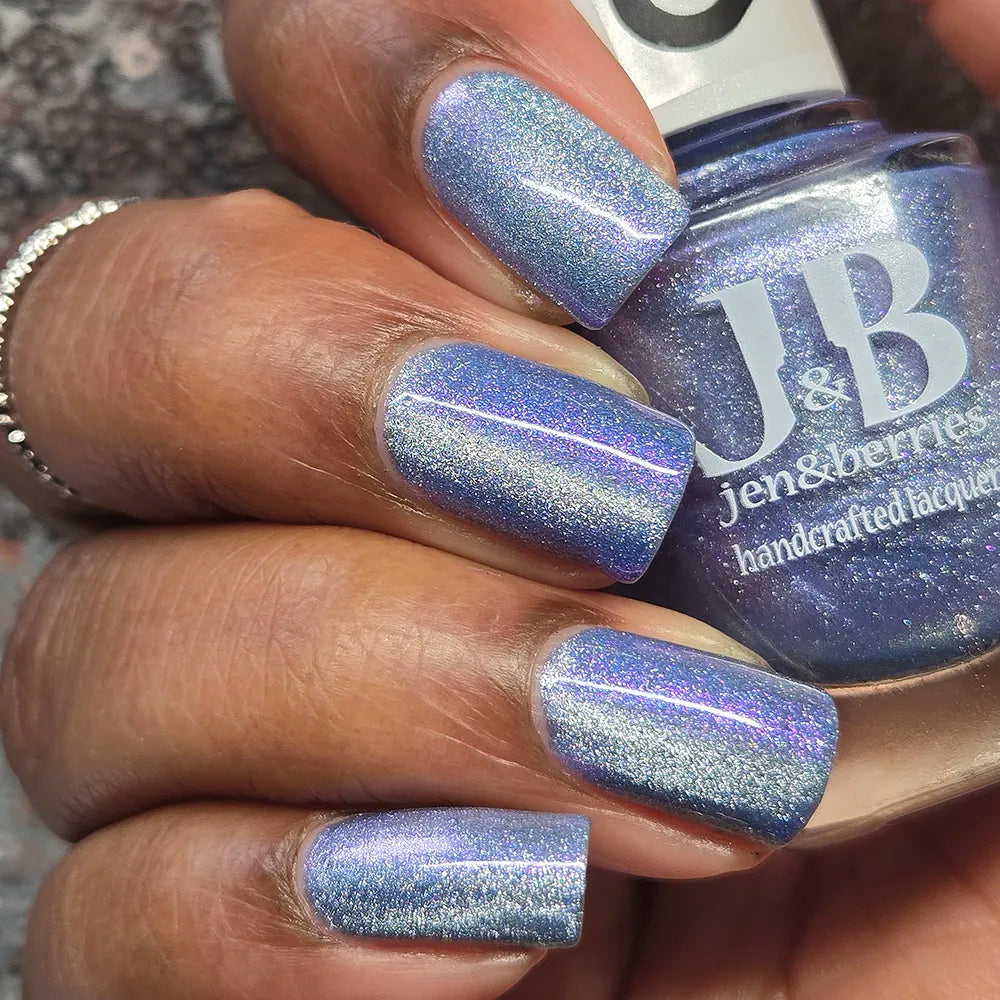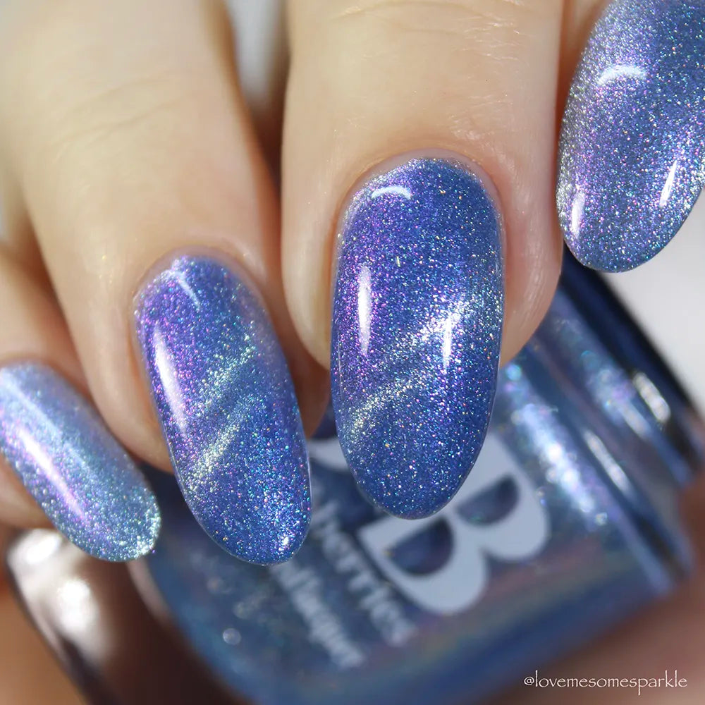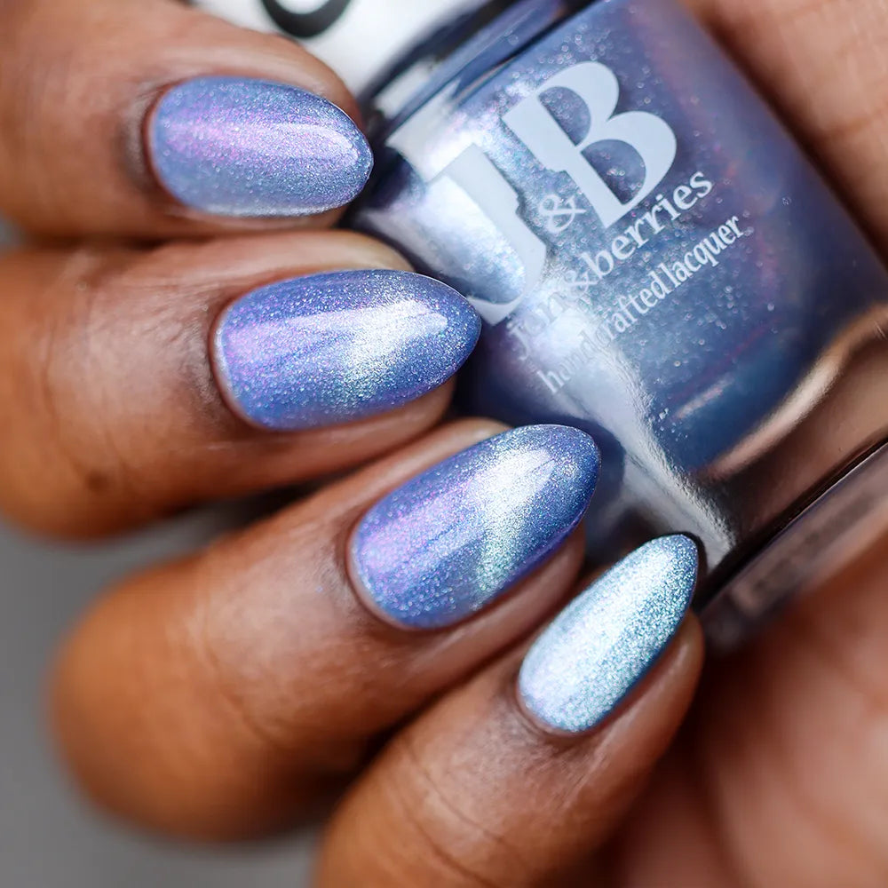 From the Lord of the Rings collab with @lovemesomesparkle, Still Counts as One is a periwinkle crelly nail polish with a purple/pink shifty shimmer, holographic microflakes and silver magnetic shimmer.