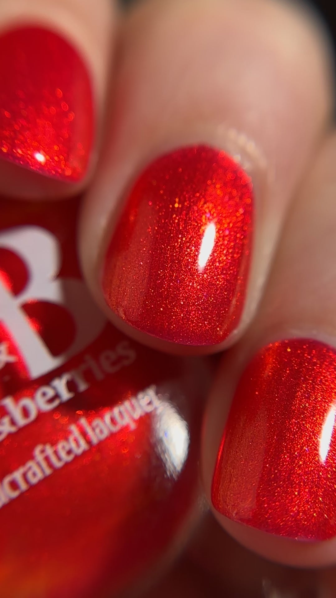 This is a right red nail polish with intense red/orange shimmer. Don't let the slightly pinkish first coat alarm you - let that shimmer build up in multiple coats into that fiery red