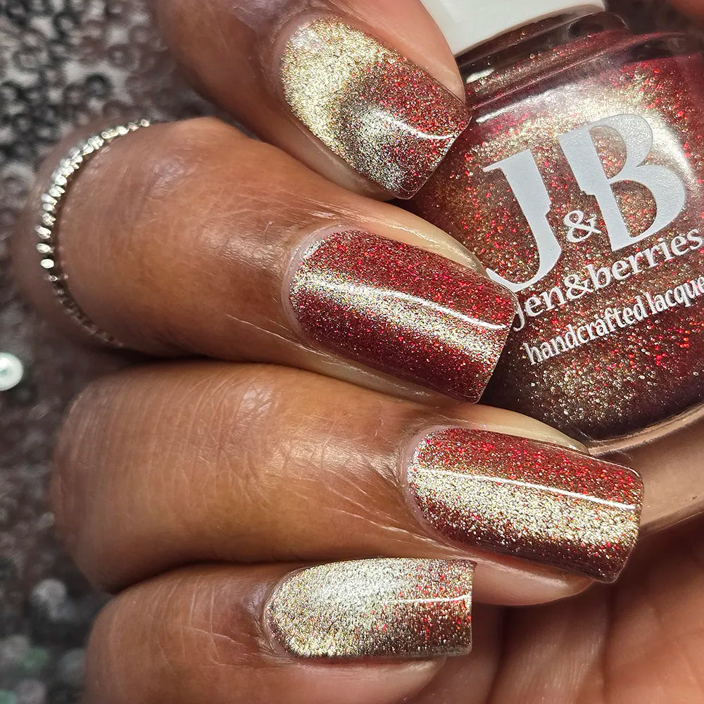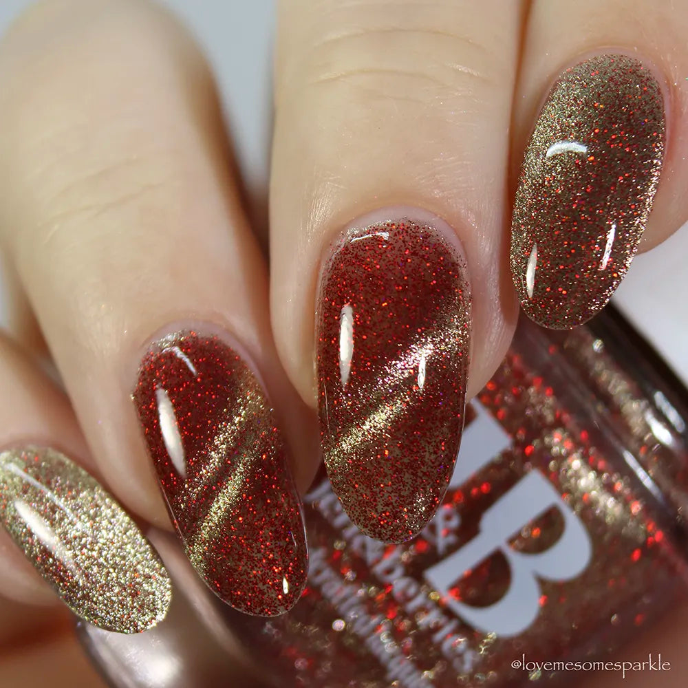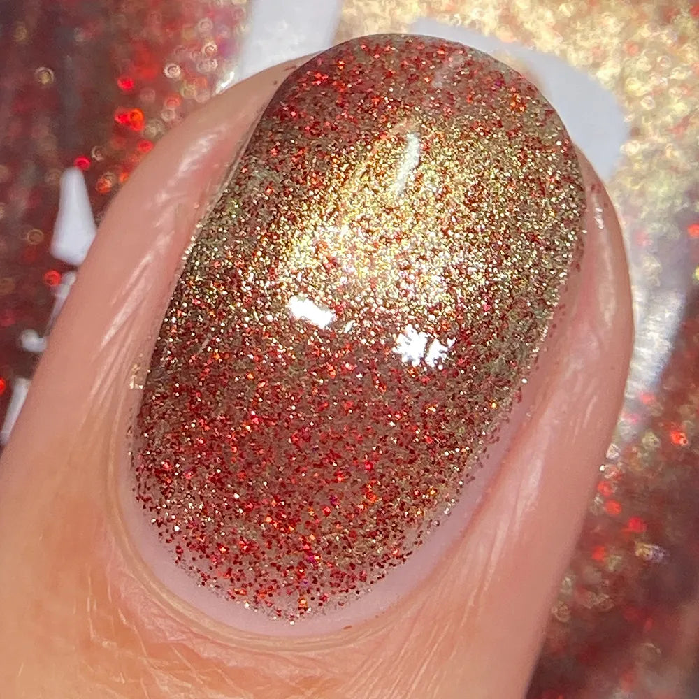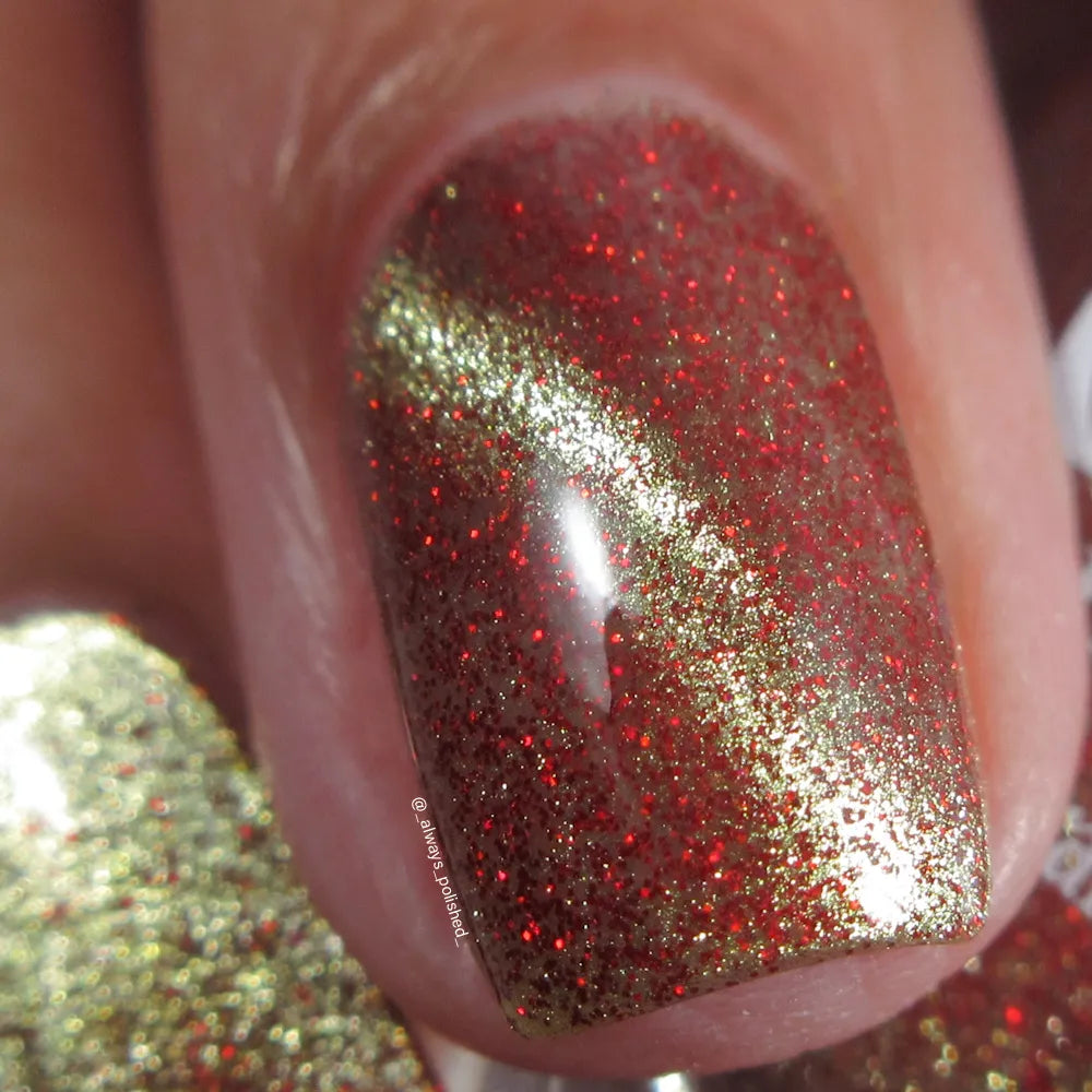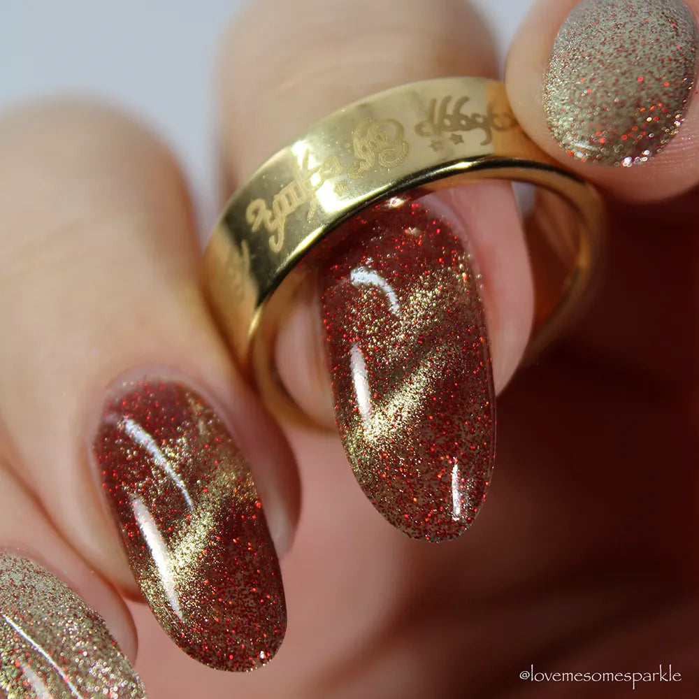 From the Lord of the Rings collab with @lovemesomesparkle, The Beacons are Lit! has a clear base loaded with red holographic microglitter and a gold magnetic shimmer.
