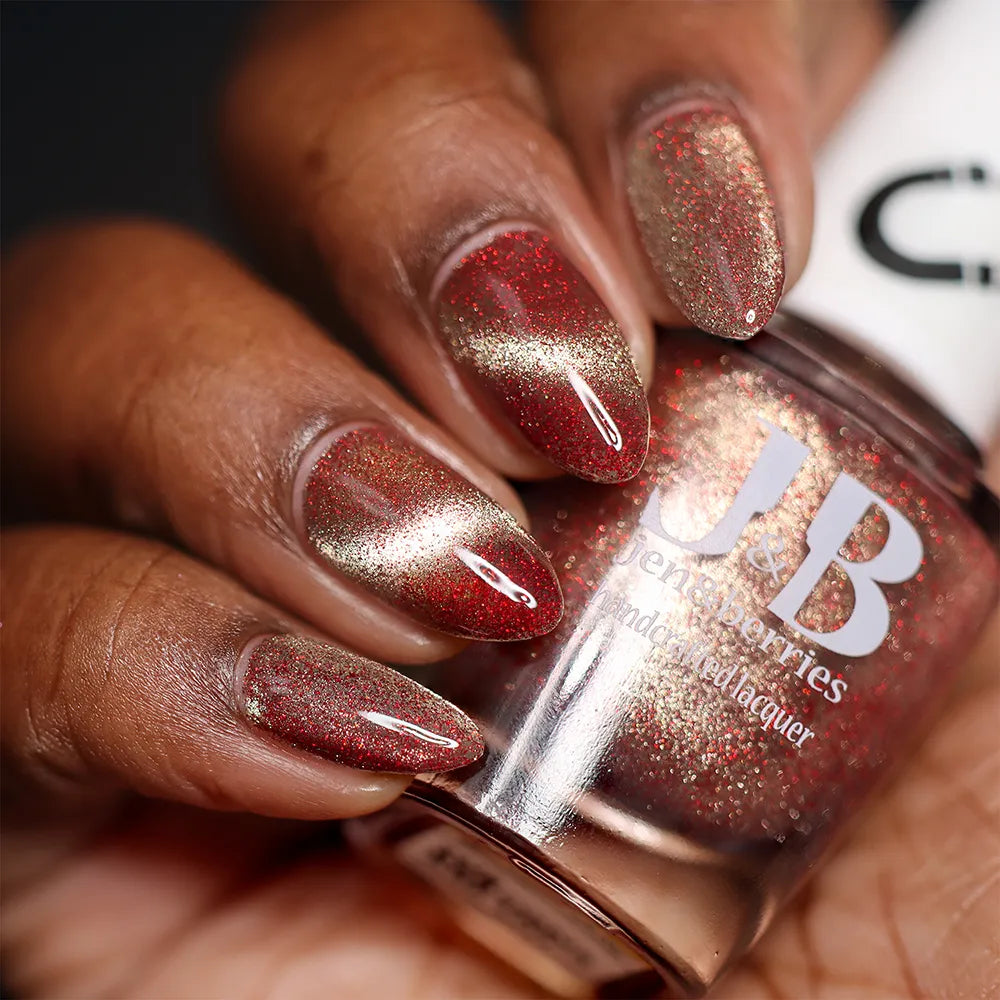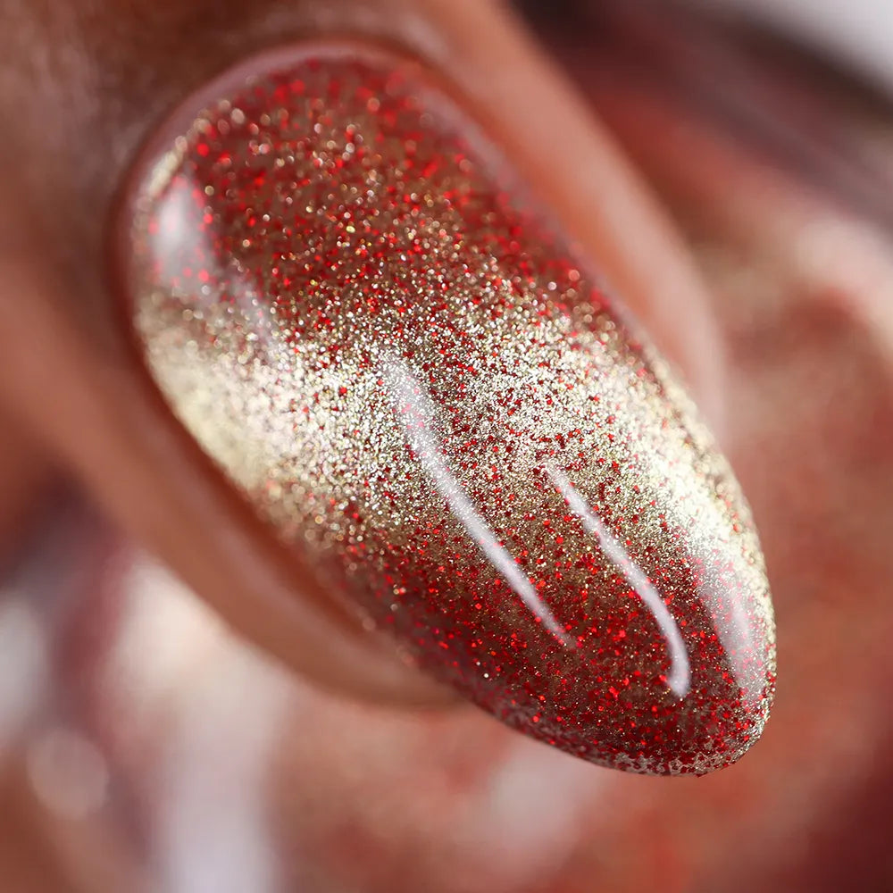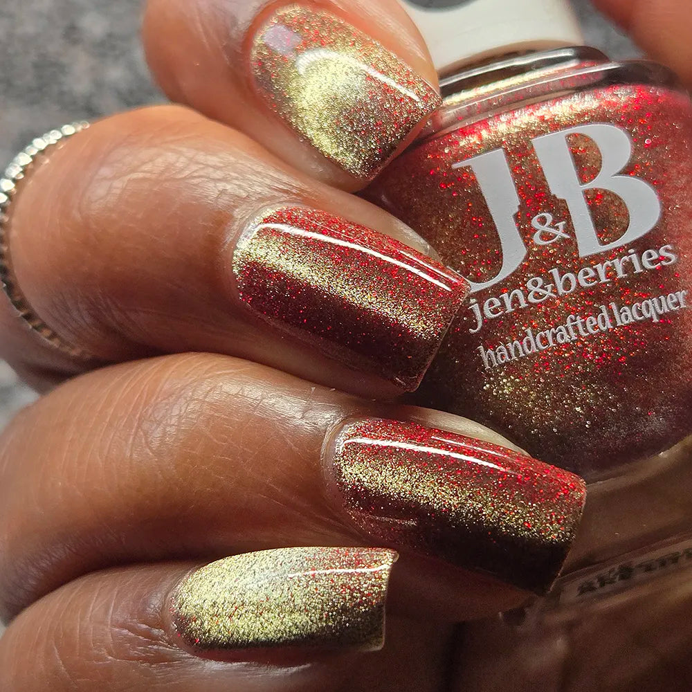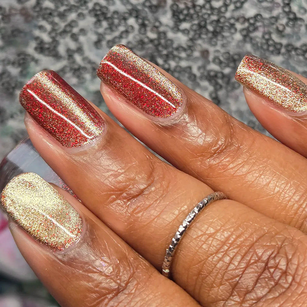 From the Lord of the Rings collab with @lovemesomesparkle, The Beacons are Lit! has a clear base loaded with red holographic microglitter and a gold magnetic shimmer.