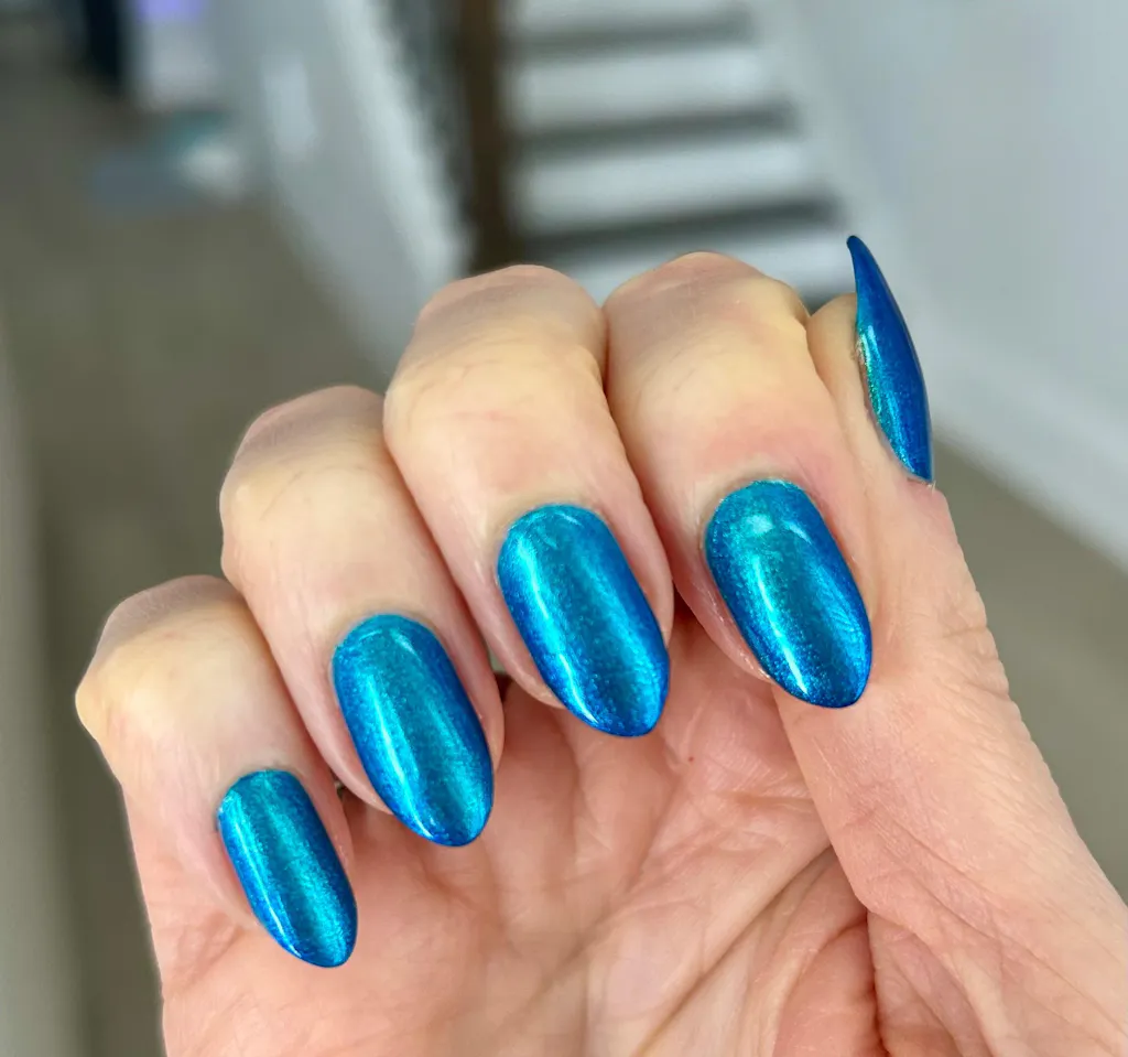 Towards the beginning of the episode, Willow remarked that maybe Angel had "the holiday blues." This polish is a semi-sheer cerulean blue base with strong teal to bold blue shimmer. Has the illusion of opacity in some angles.