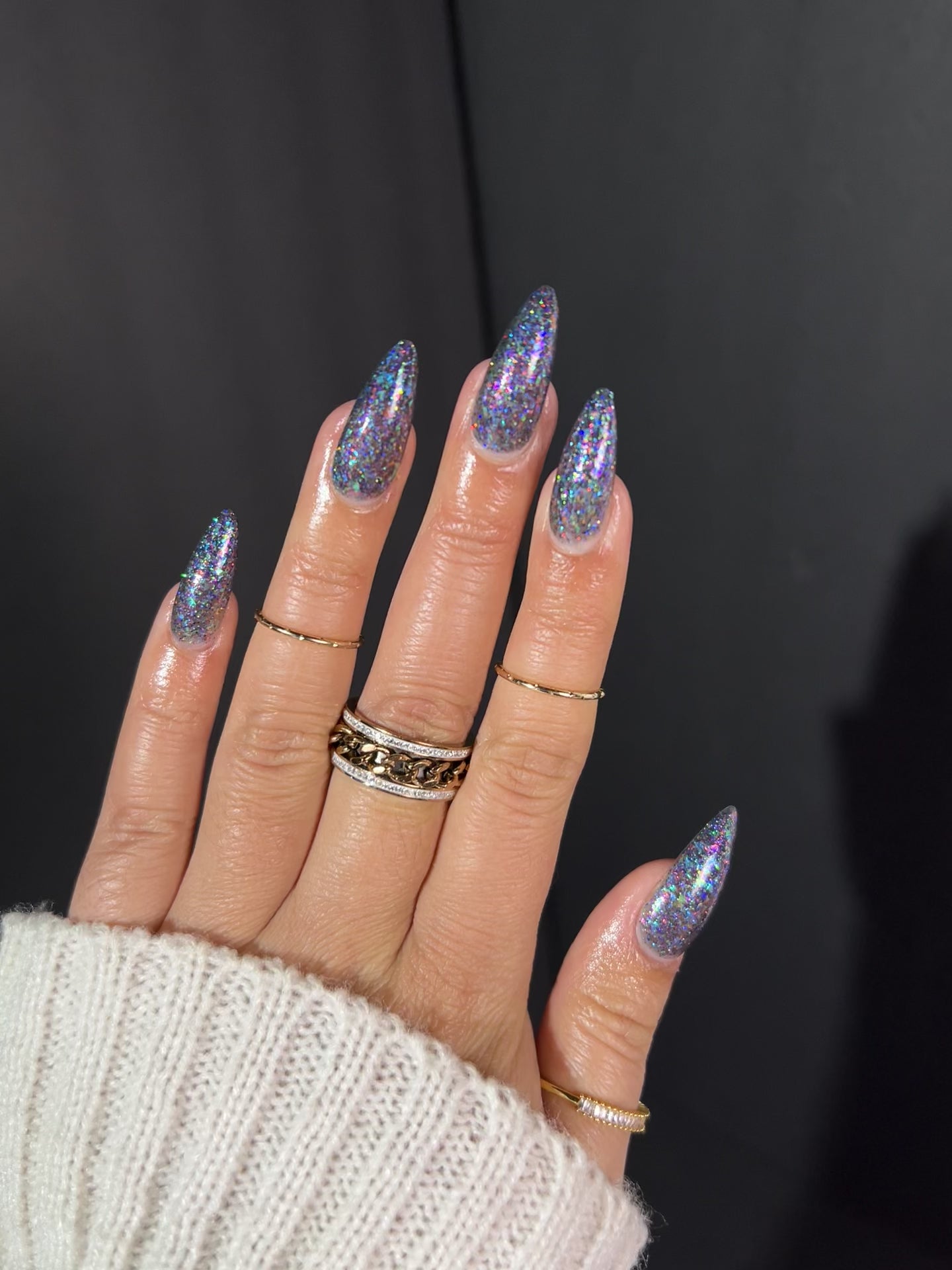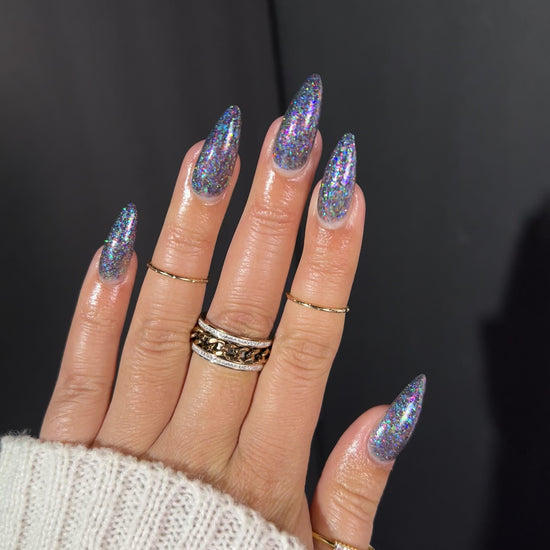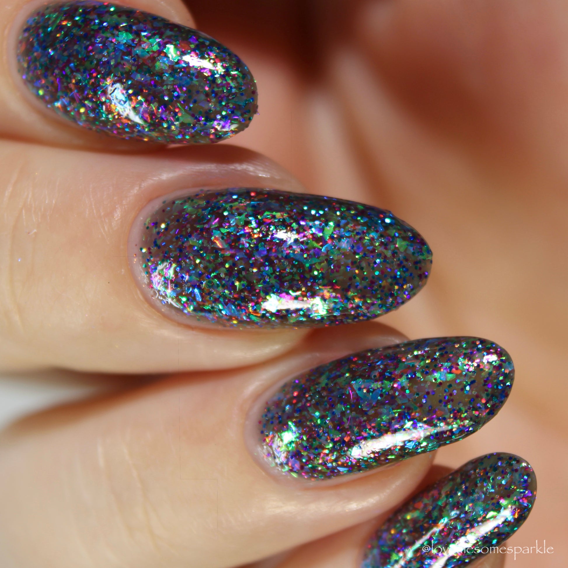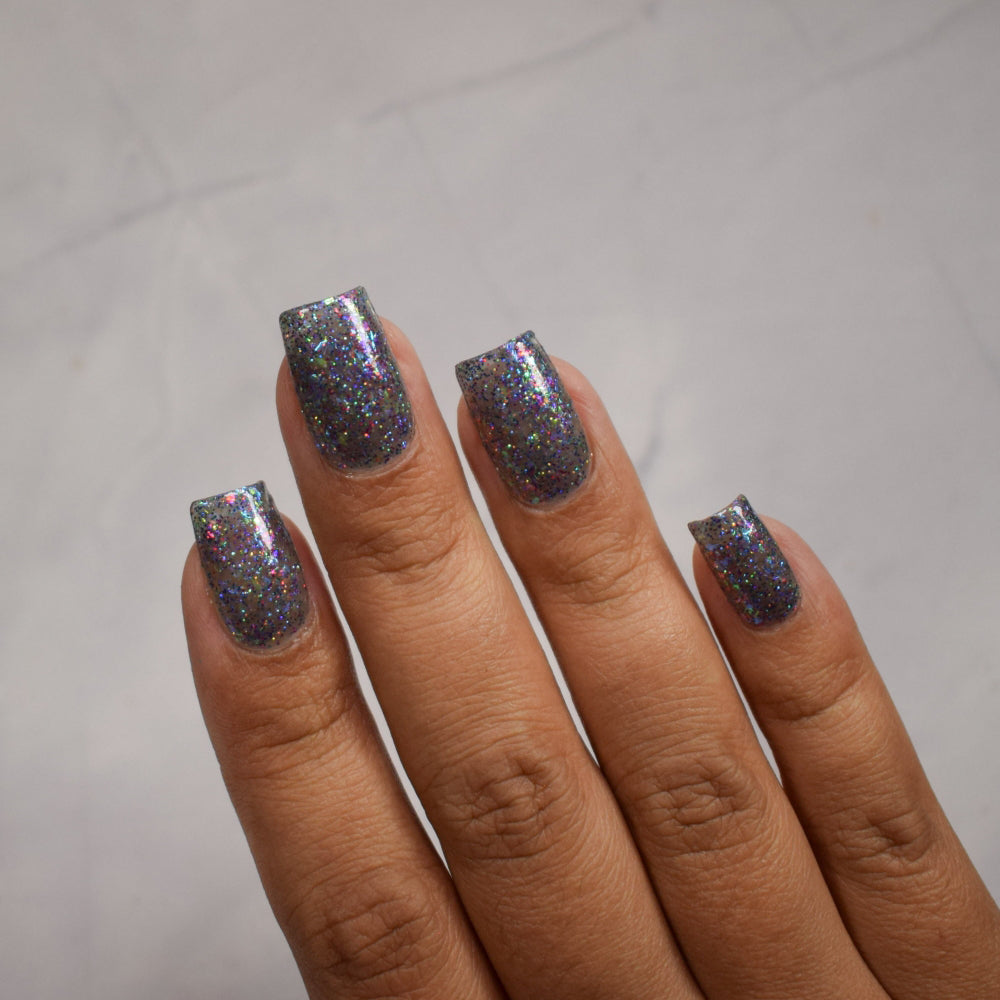 This flakie nail polish has a sheer charcoal base with a rainbow of scattered holographic microglitter and shifting iridescent flakes.