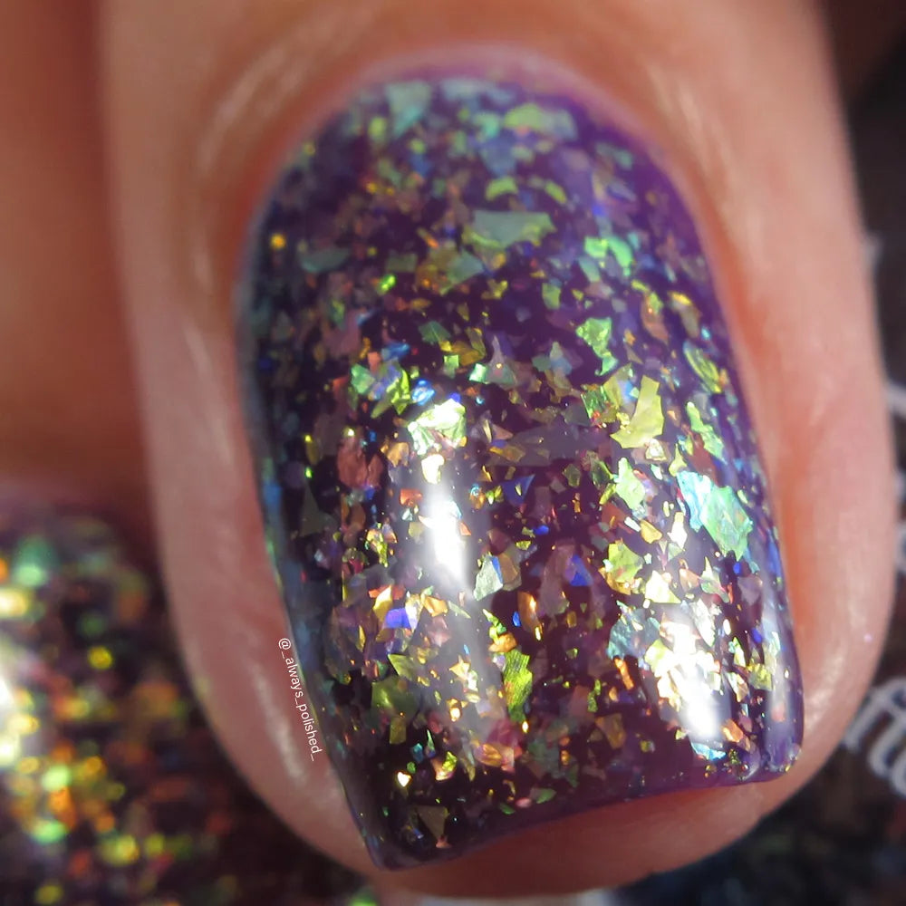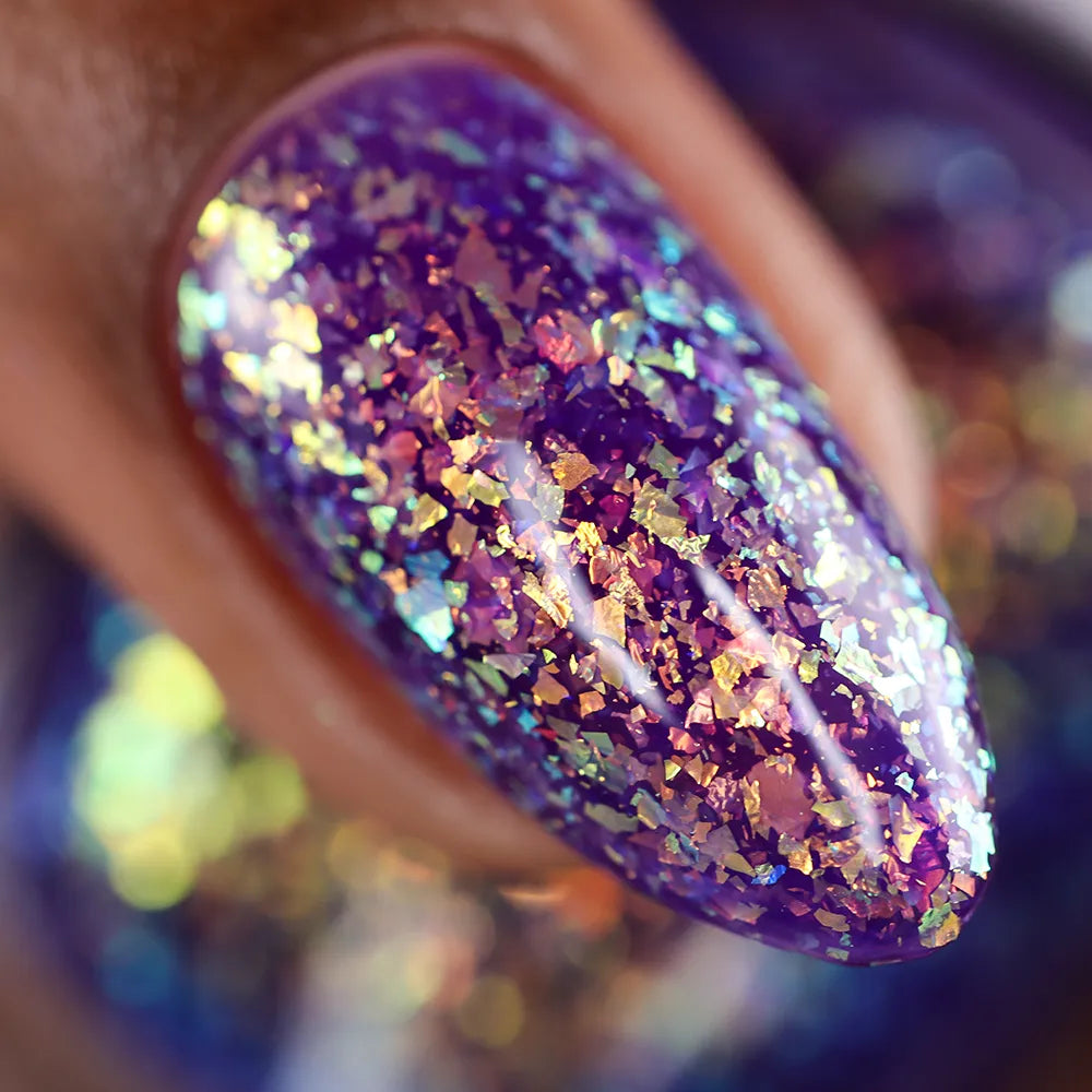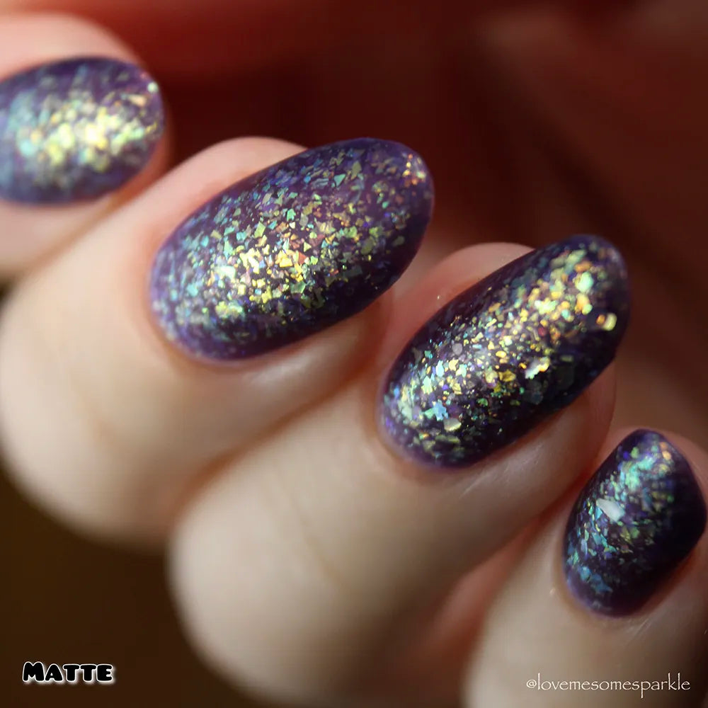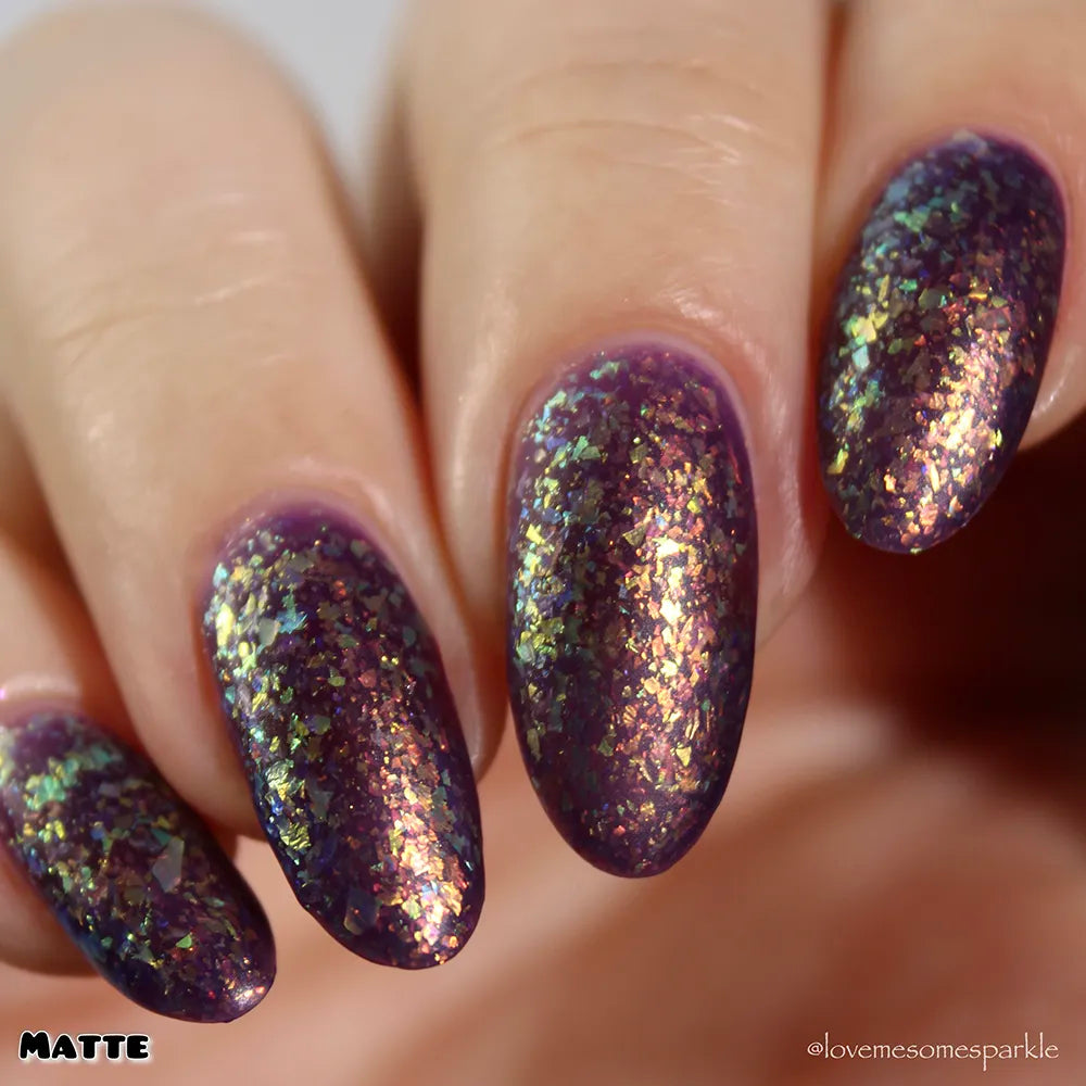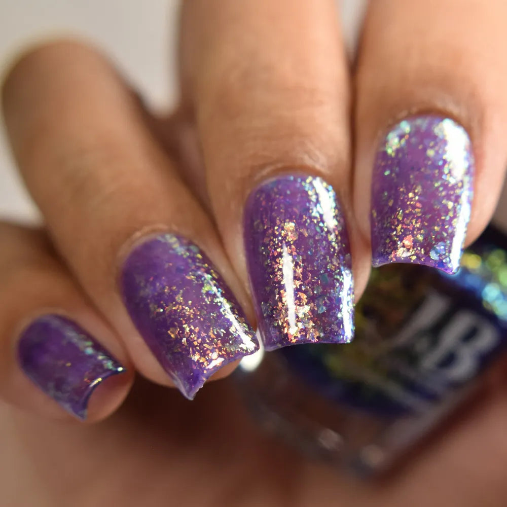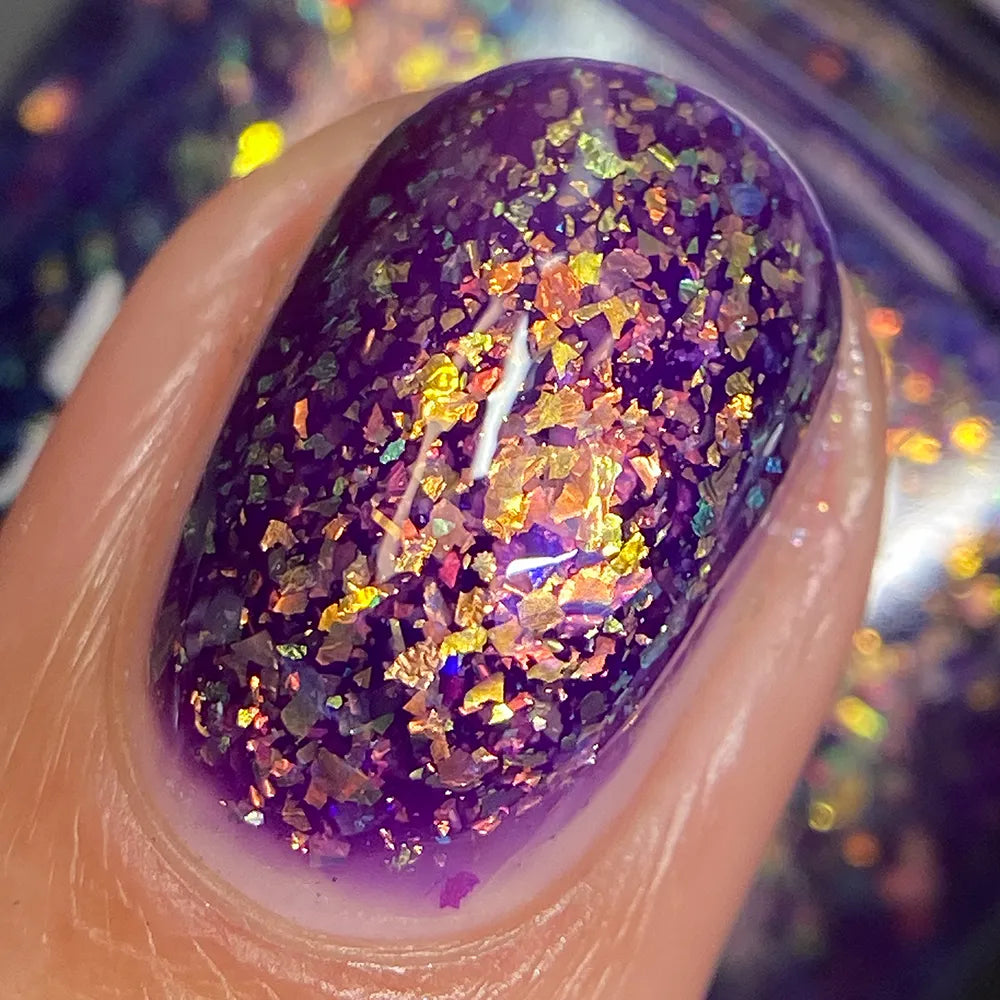From the Lord of the Rings collab with @lovemesomesparkle, What's the Elvish word for friend? is a purple jelly nail polish packed with orange/gold/green shifty iridescent flakes.