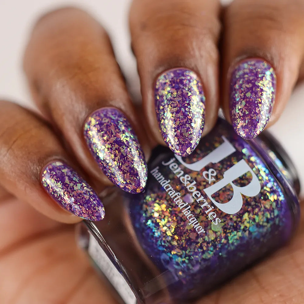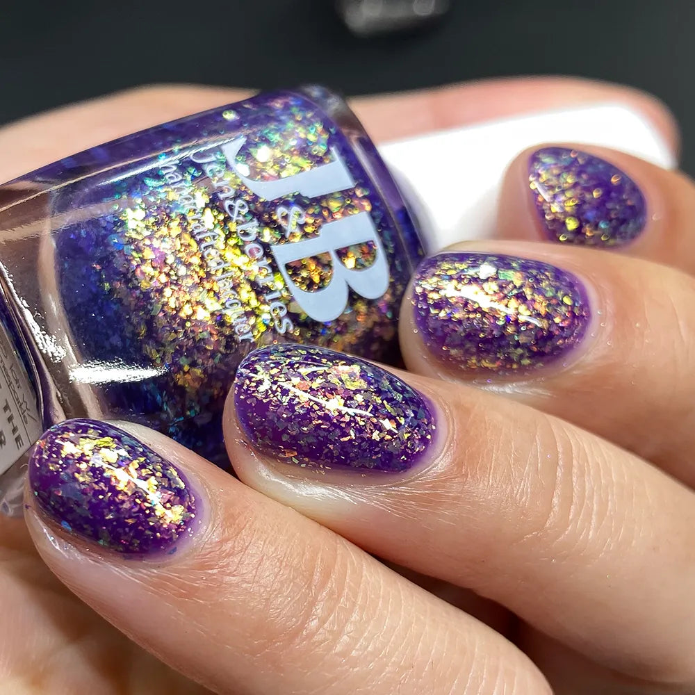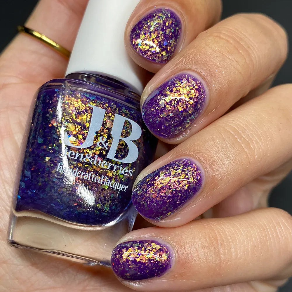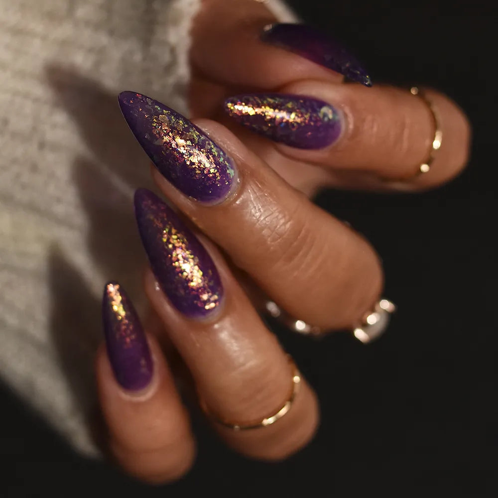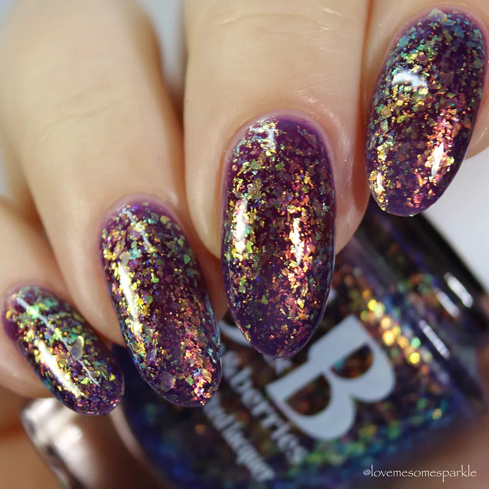 From the Lord of the Rings collab with @lovemesomesparkle, What's the Elvish word for friend? is a purple jelly nail polish packed with orange/gold/green shifty iridescent flakes.