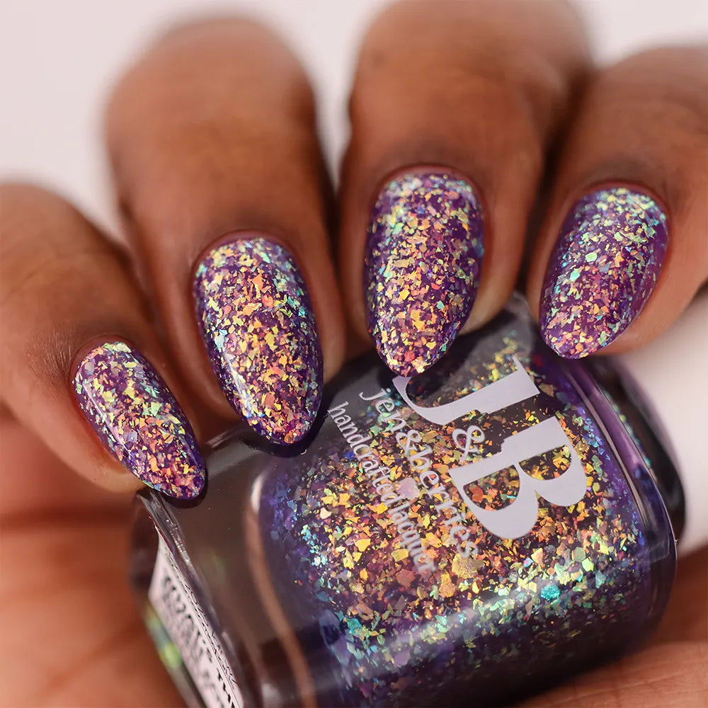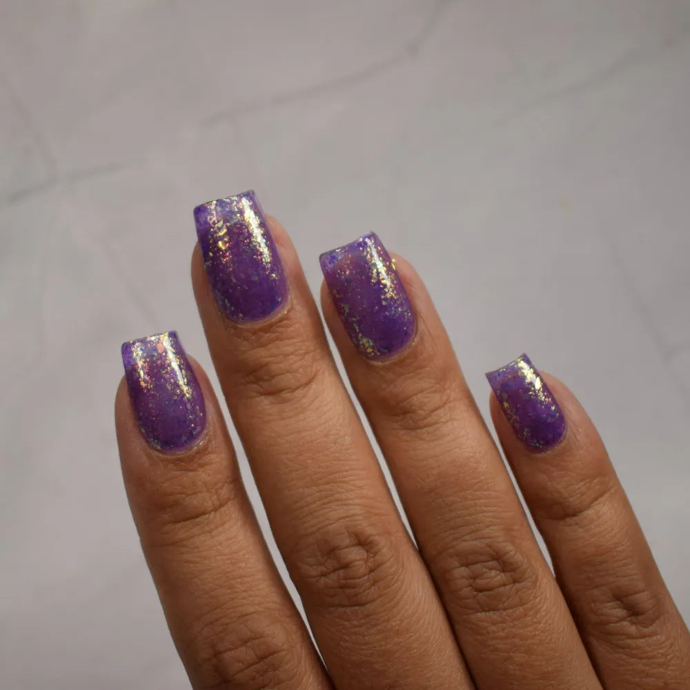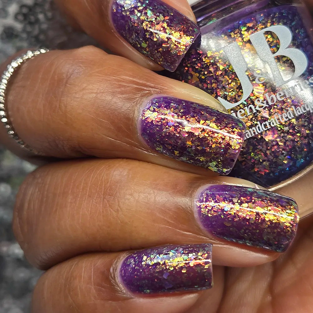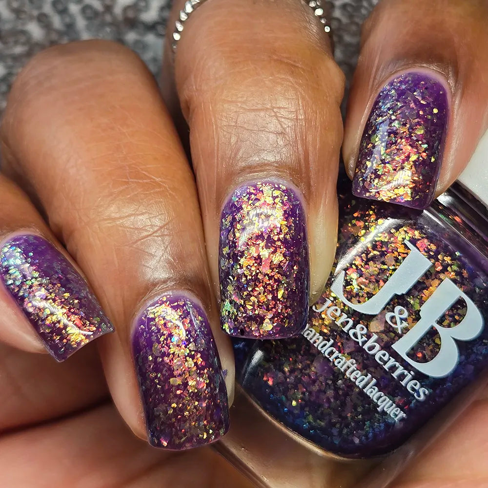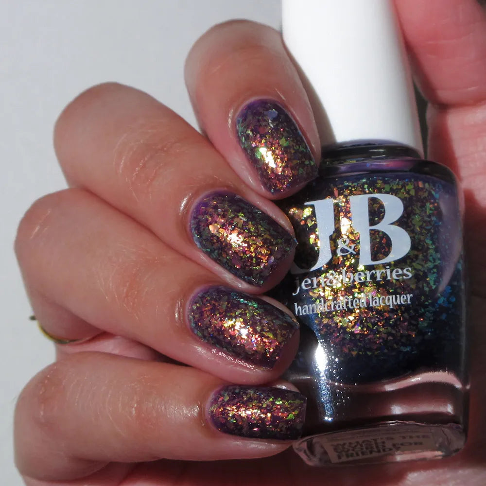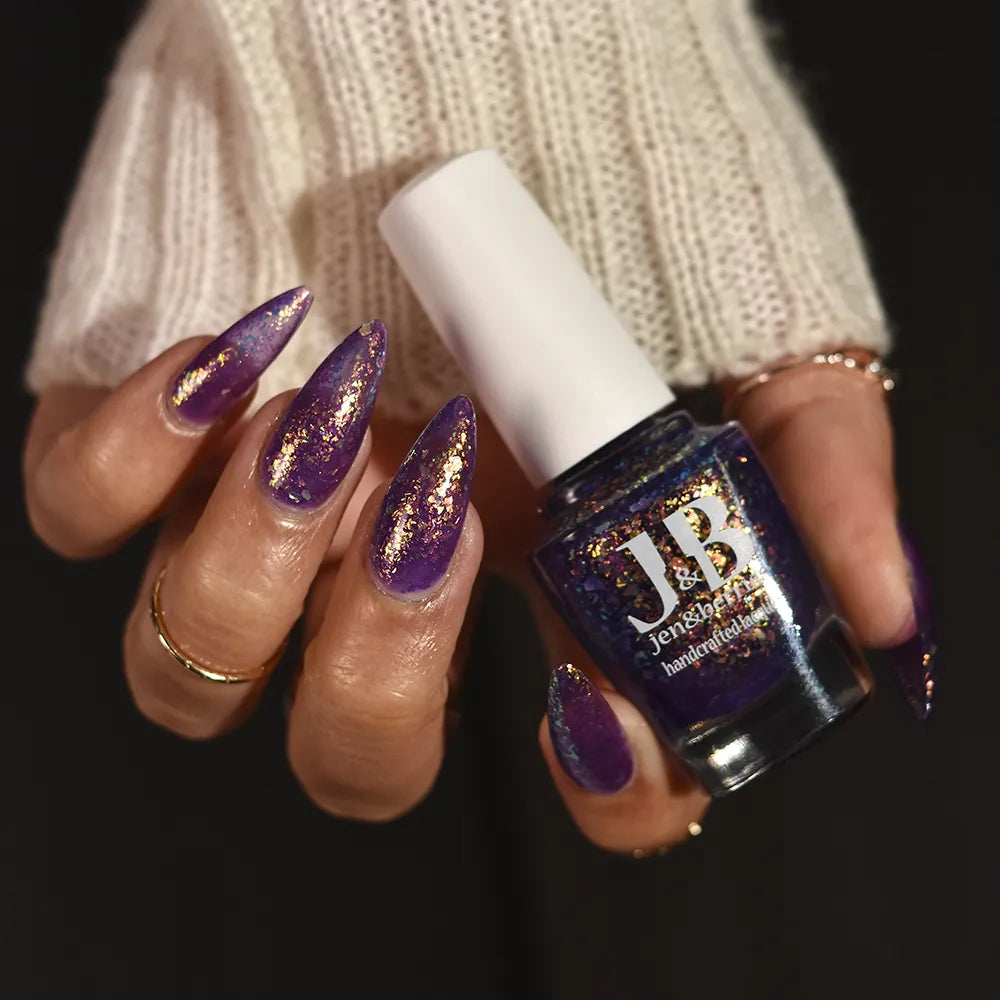 From the Lord of the Rings collab with @lovemesomesparkle, What's the Elvish word for friend? is a purple jelly nail polish packed with orange/gold/green shifty iridescent flakes.