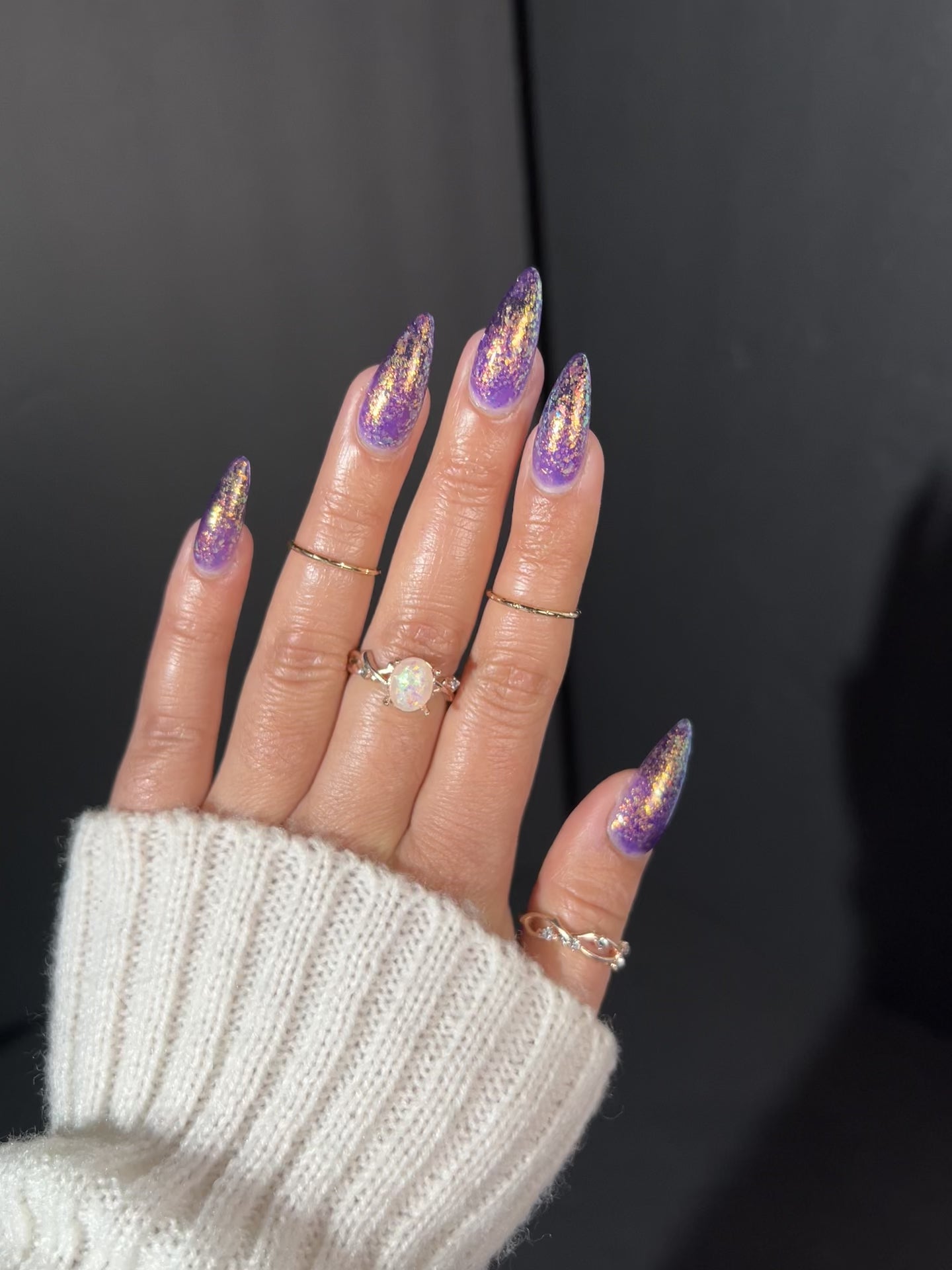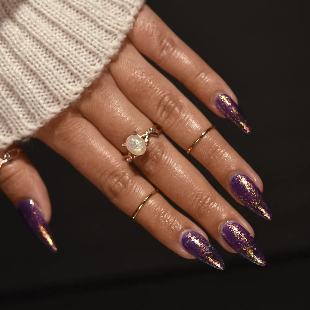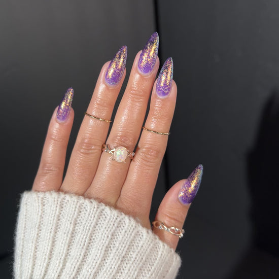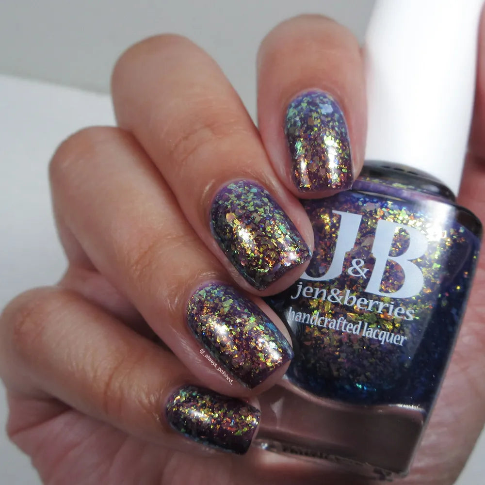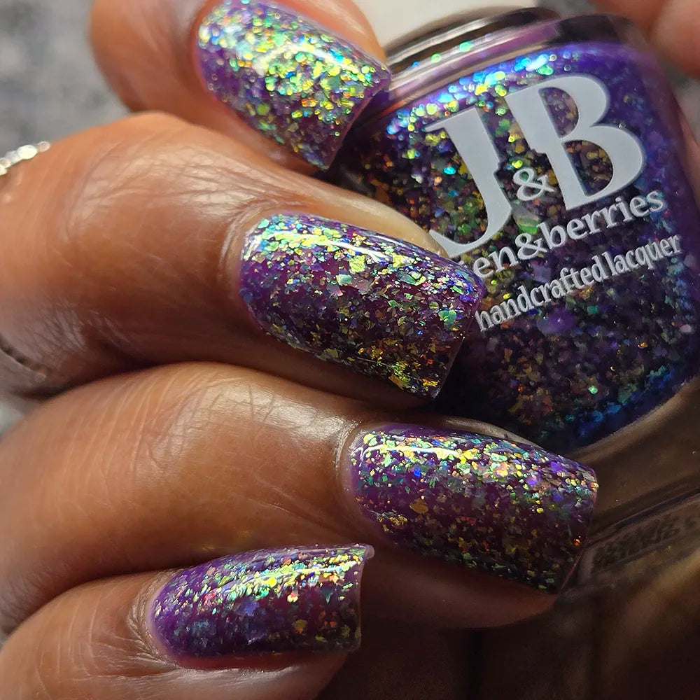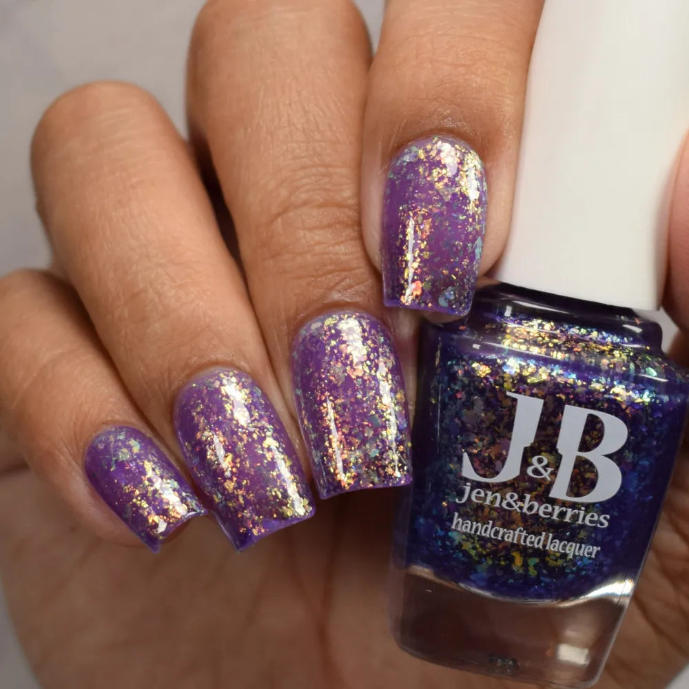 From the Lord of the Rings collab with @lovemesomesparkle, What's the Elvish word for friend? is a purple jelly nail polish packed with orange/gold/green shifty iridescent flakes.