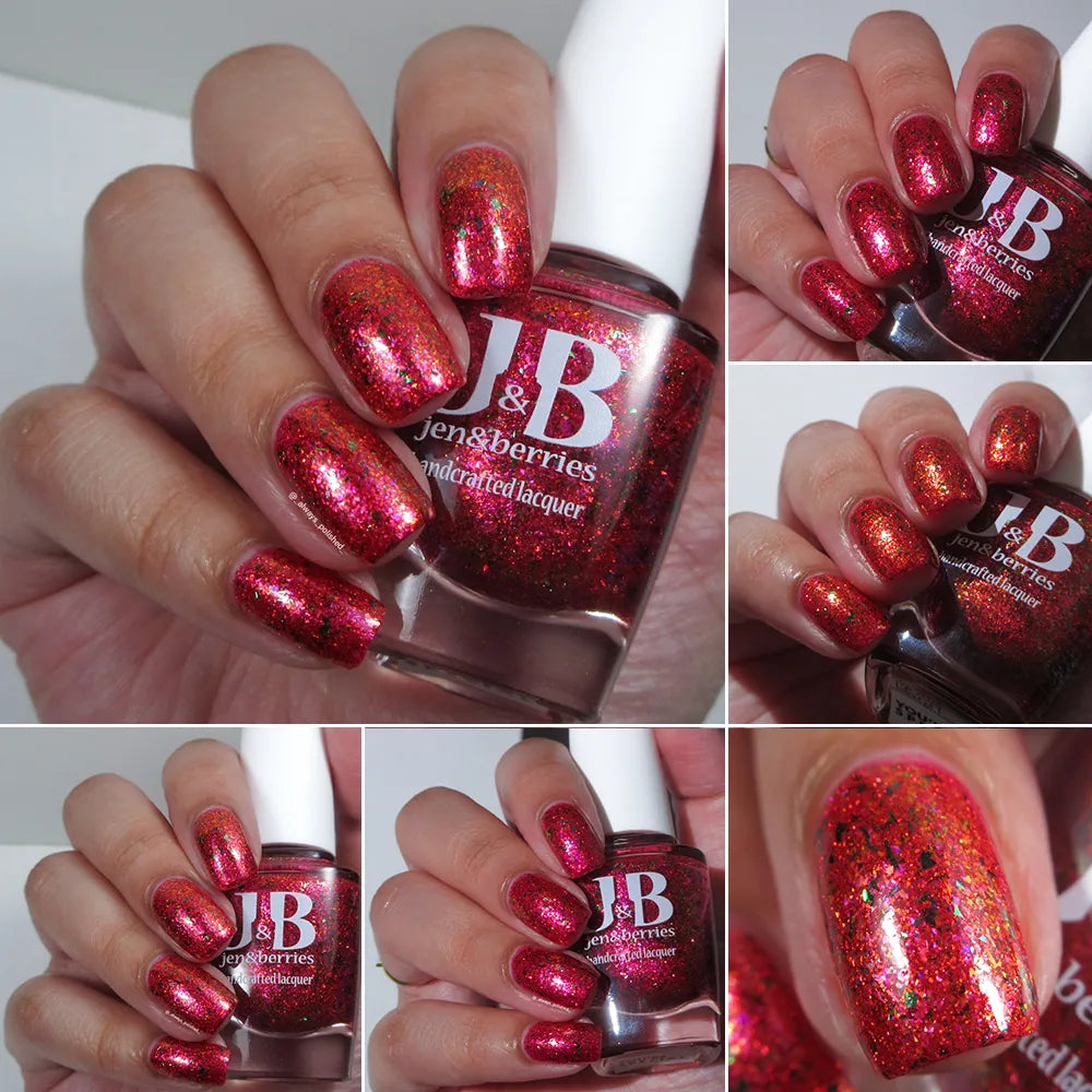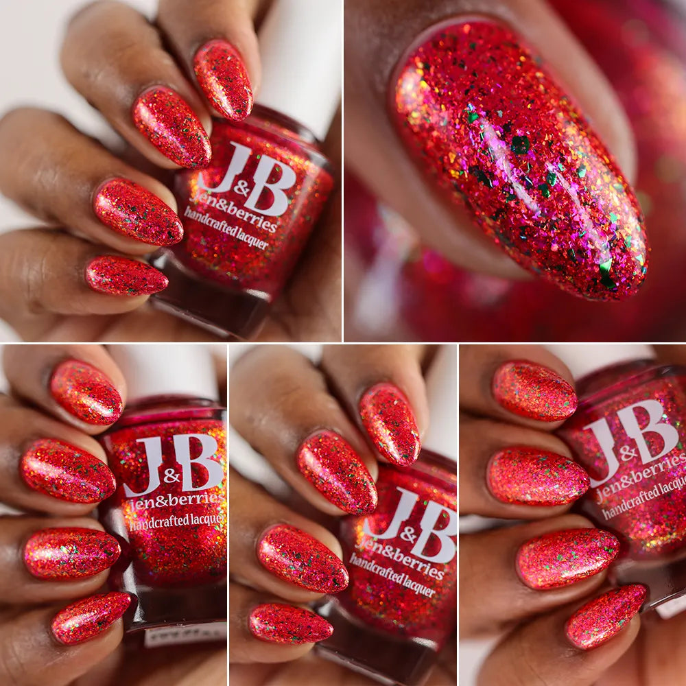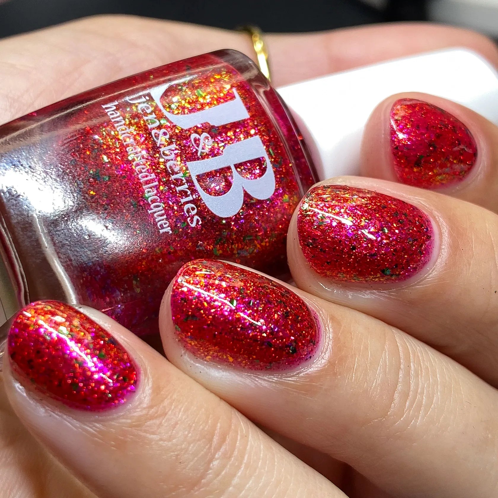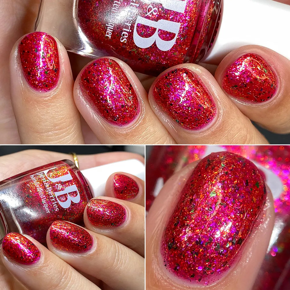 You're S.P.E.C.I.A.L. has a pinky red base with small pink/red and red/orange shifting flakes, red holographic microglitter and green metallic flakes.