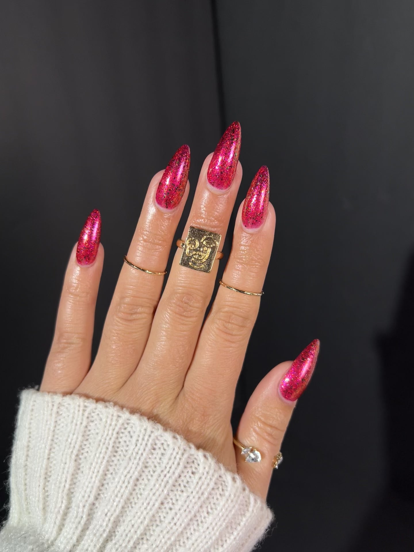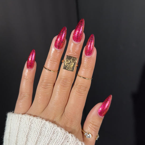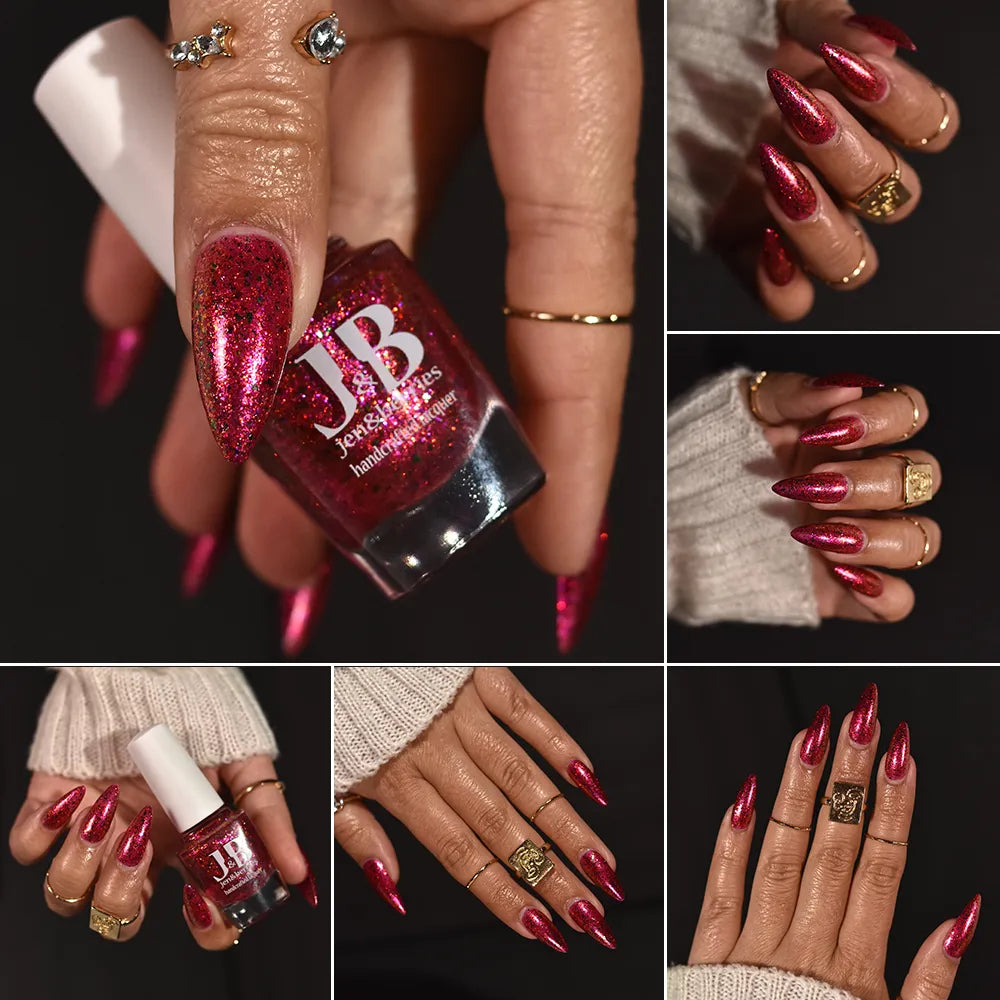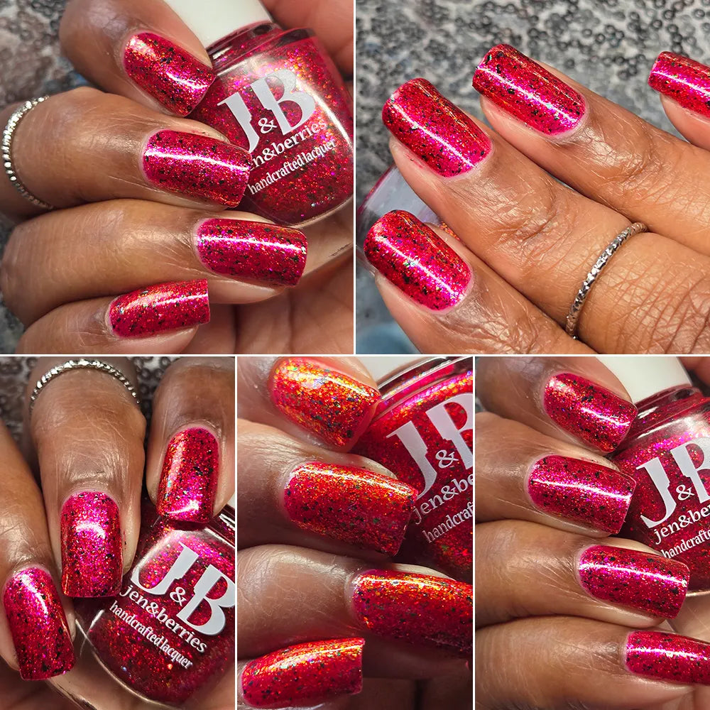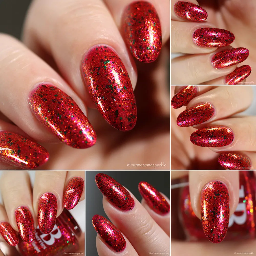 You're S.P.E.C.I.A.L. has a pinky red base with small pink/red and red/orange shifting flakes, red holographic microglitter and green metallic flakes.